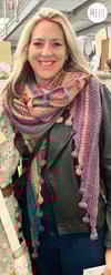 I designed this large wrap as I wanted something that I could cozy up with – it’s like a blanket you can wear! It is aimed at confident beginners and for people that want a relaxing, repetitive project that keeps your attention because of the colour changes and the cool way the bobble pom poms match the colour of the stripes.