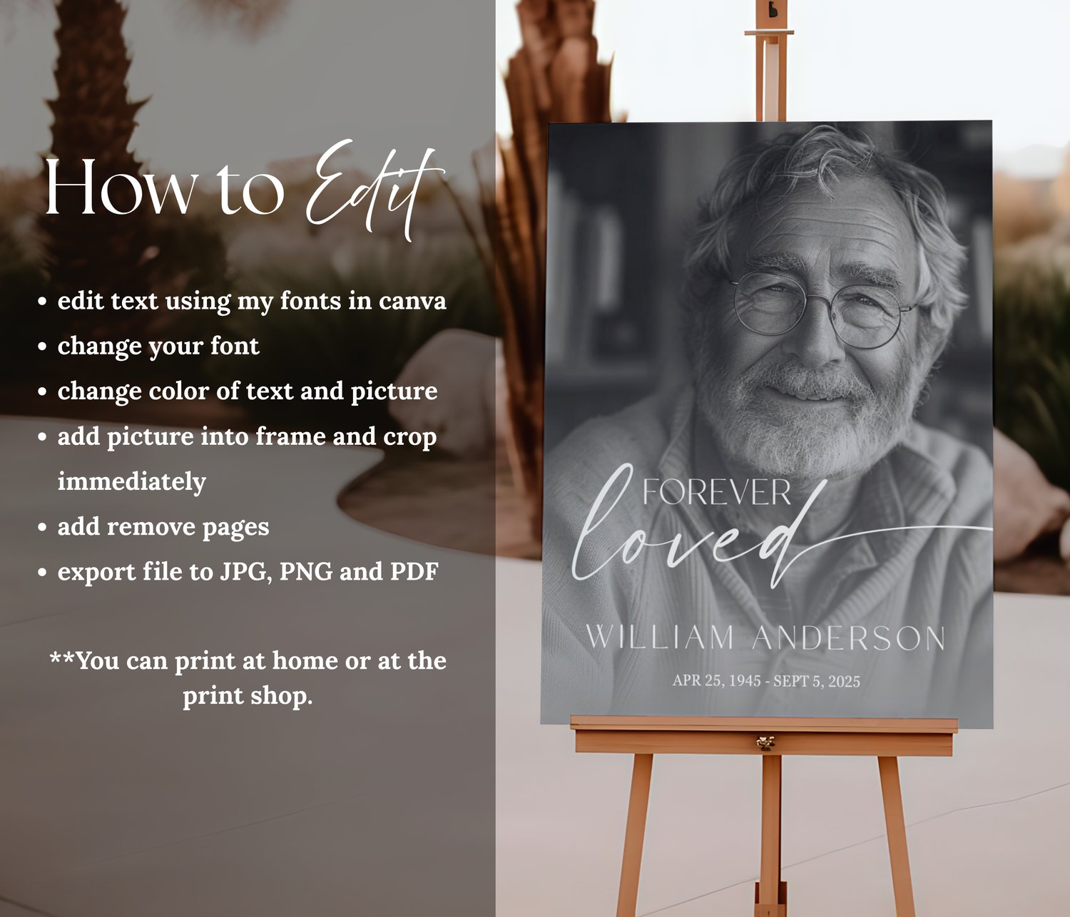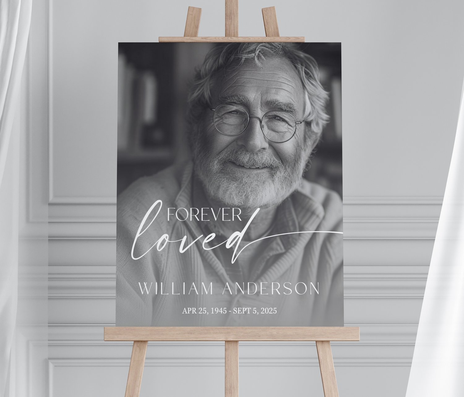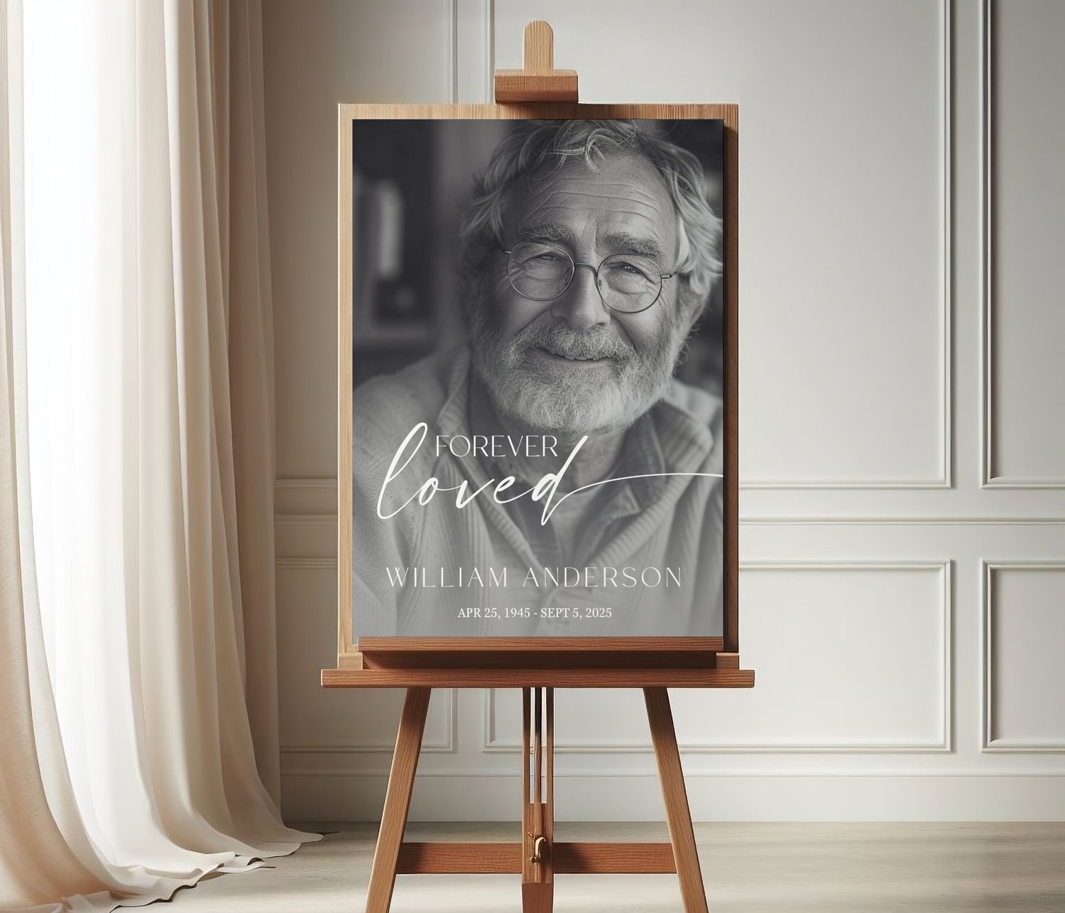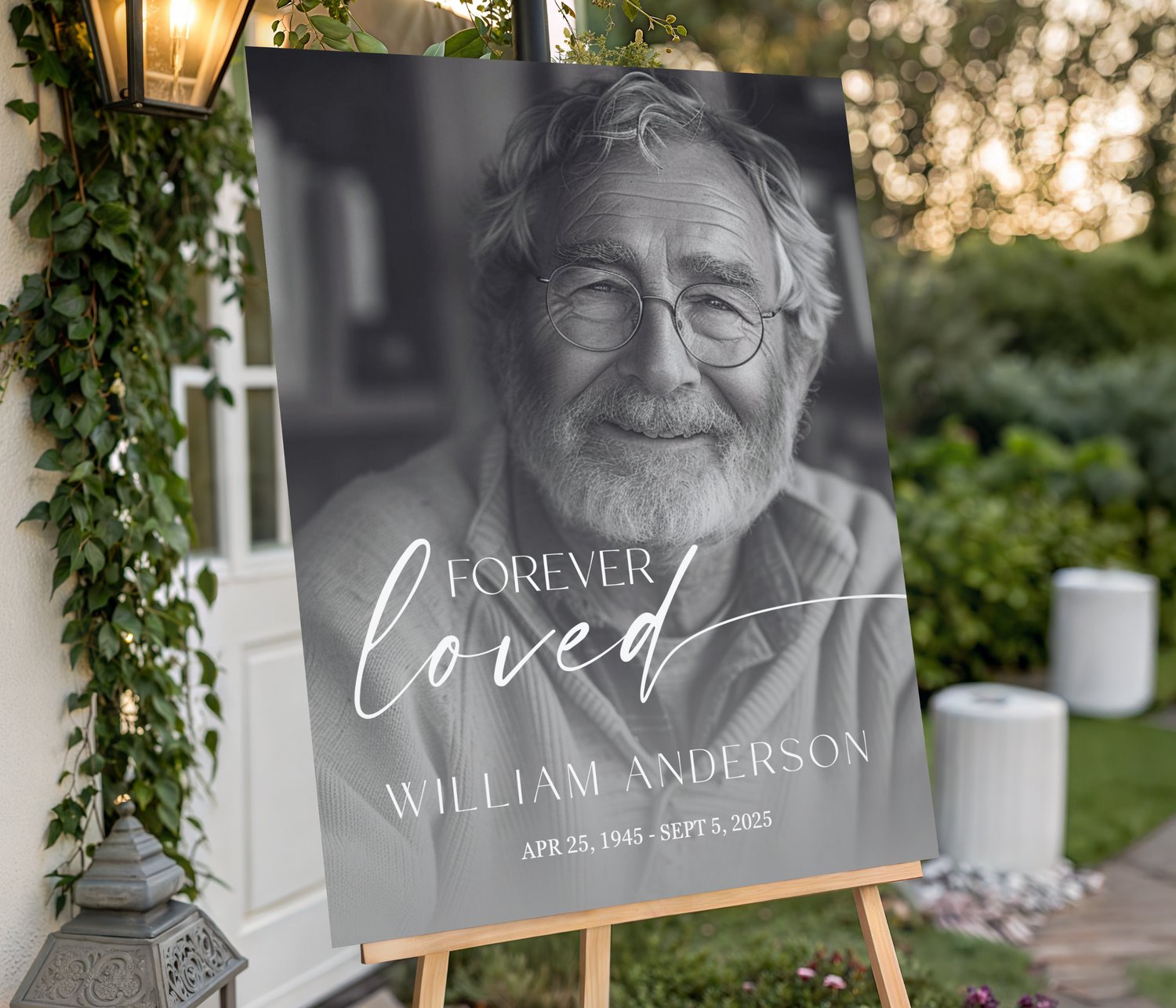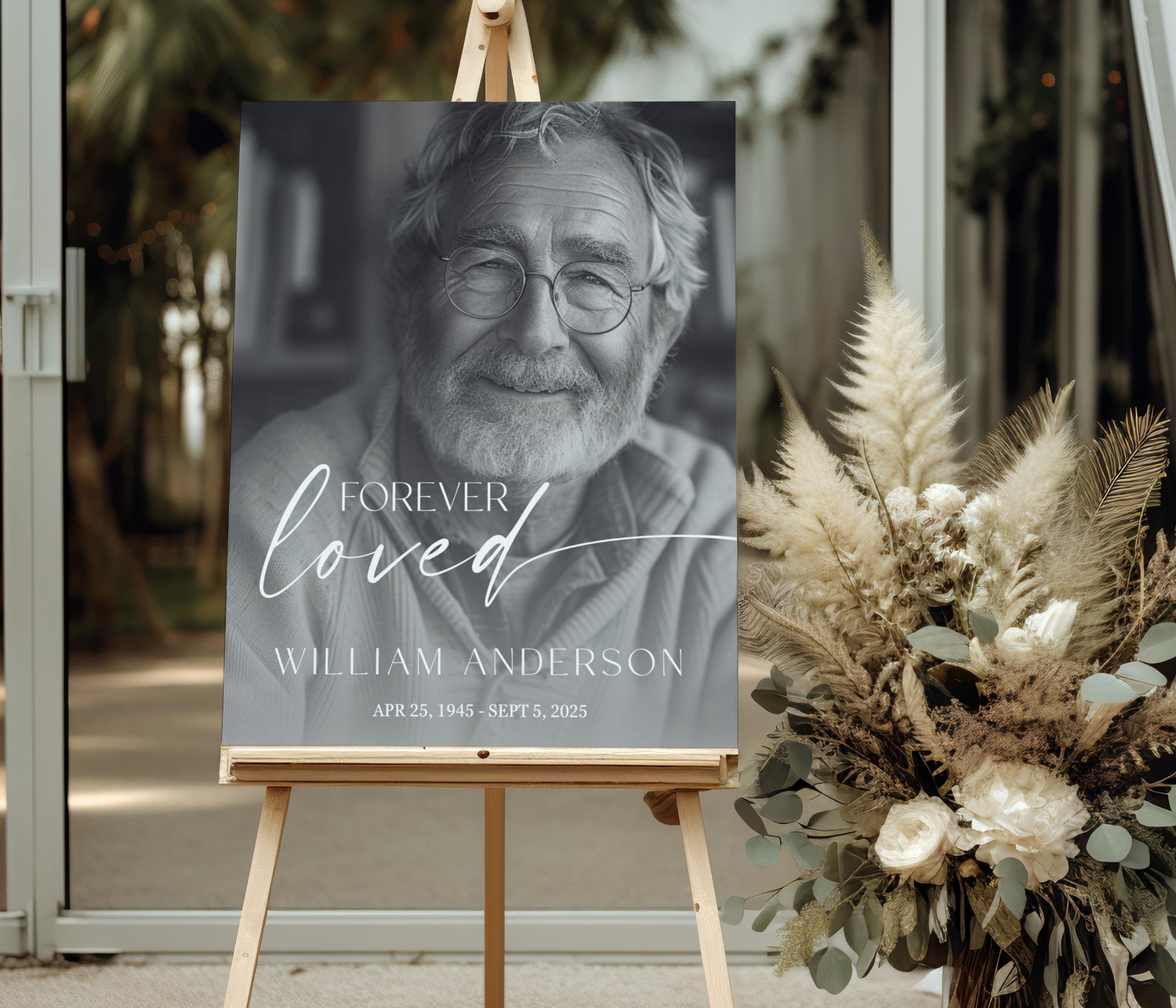 A beautifully designed funeral welcome sign to honor and celebrate the life of your loved one. This elegant memorial sign provides a heartfelt touch to your service, helping guide guests with grace and dignity. Perfect for displaying at the entrance of a funeral, memorial service, celebration of life, or wake.