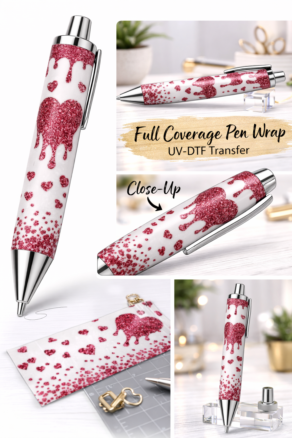 Designed with a stunning glitter-style melting heart effect and scattered mini hearts, this wrap gives your pens a trendy, high-impact look that stands out instantly.