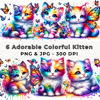 6 Adorable Colorful Kitten Watercolor Print PNG files in size: 5000 x 5000 pixels in 300 DPI with transparent and white background.