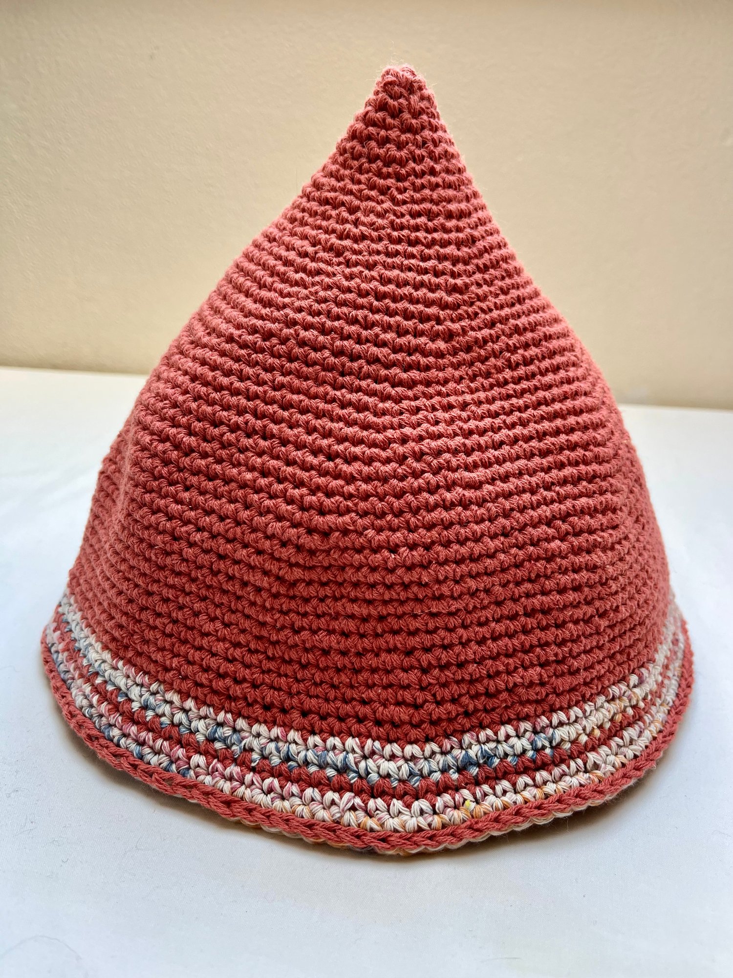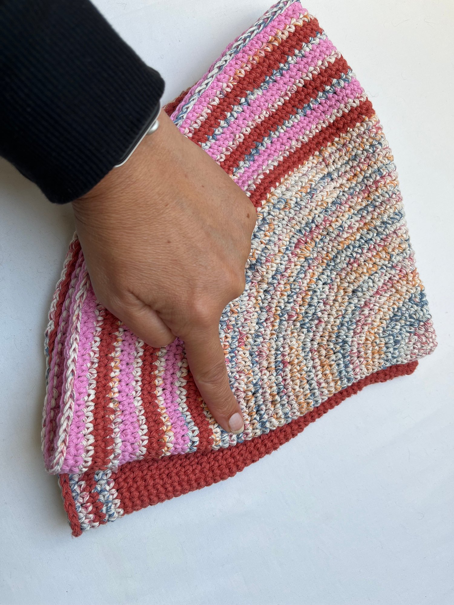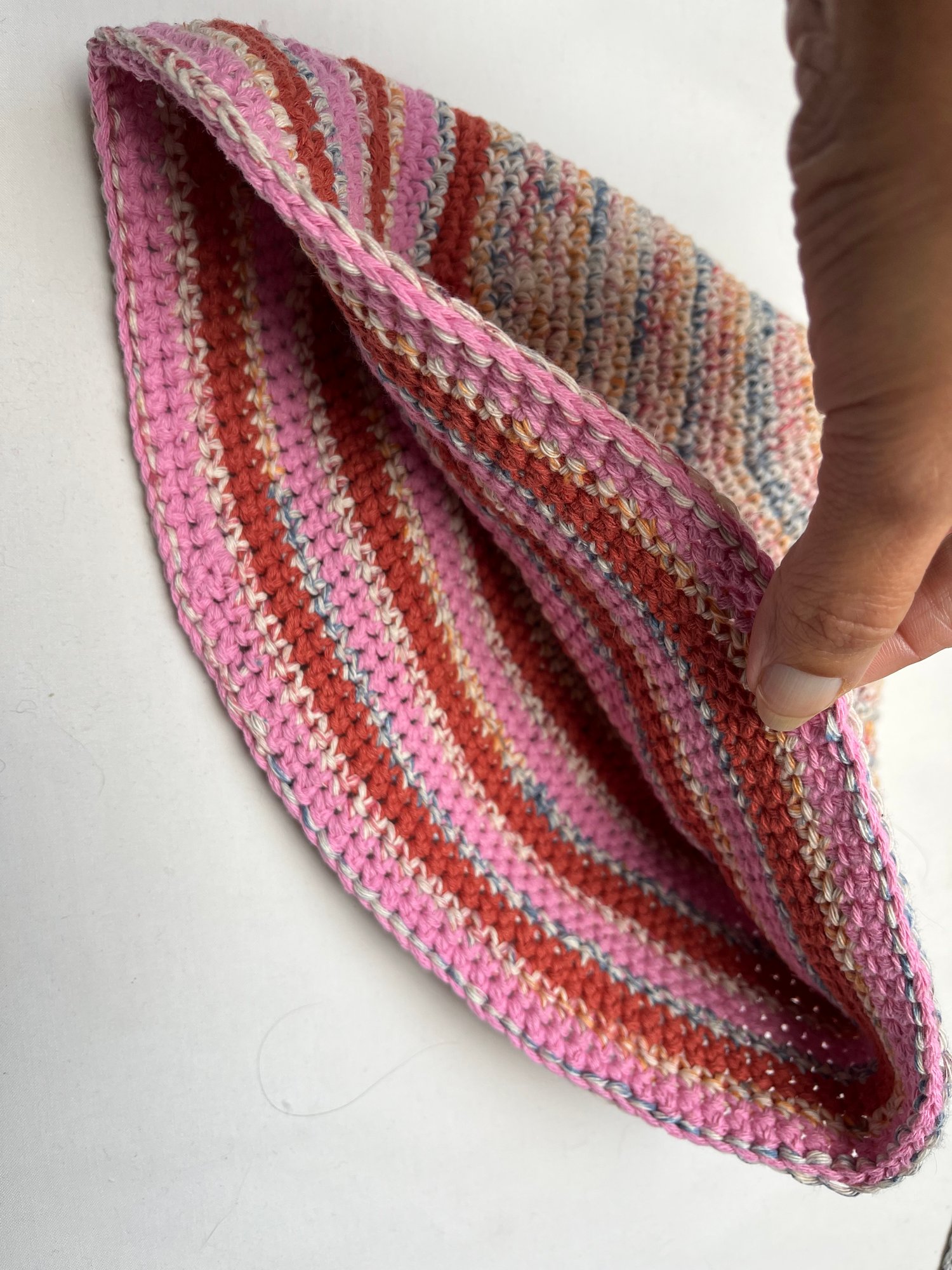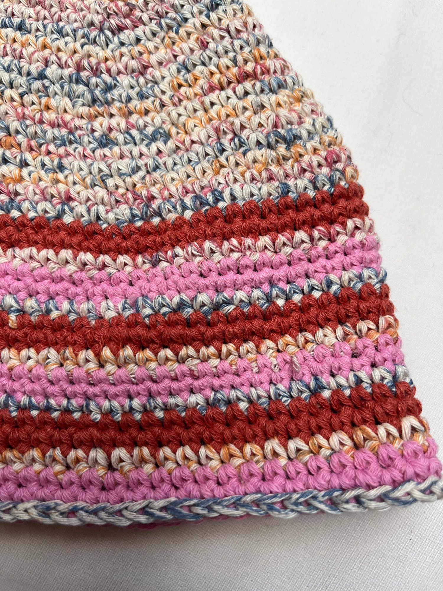 - Dámská verze: Je háčkovaná z příjemné příze Inka (směs bavlna a akryl) v hravém batikovaném, barevném provedení.