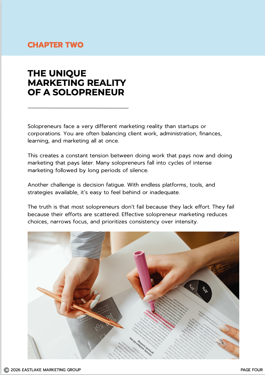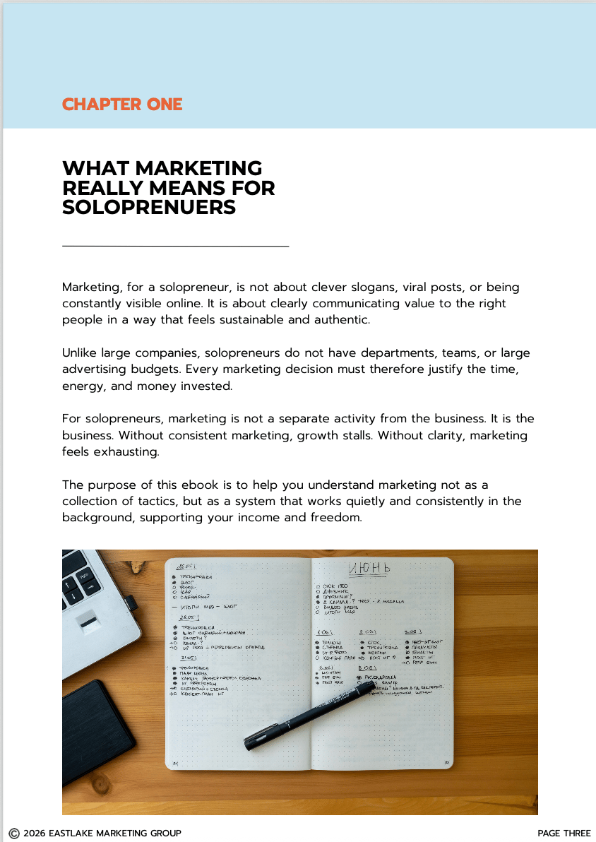 Designed specifically for one-person businesses, this guide breaks down marketing into clear, sustainable systems that actually fit a solopreneur’s reality.