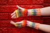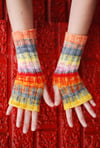 - DK weight yarn in lots of small leftover balls, 100-175 yards / 90-160 meters total (for both mitts, depending on size) — samples are in Infinite Twist Helix, around 15-30 yards/meters each of 7 colors: Dovecote (separated into 3 stripes), Sunflower, Nancypants, Marigold, Sakura, Meringue, and Ebi