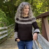 Pacem is a top down, long-sleeved pullover with fair isle patterning along the yoke and sleeves and a simple lace insert sandwiched between the fair isle on the yoke. It is the result of my yearning for a quick, oversized knit that would be comfy and warm in the winter months and allow a multitude of color options for the yoke.