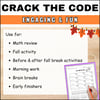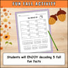 These no-prep code breaker activities are a fun way for students to practice math and critical thinking skills. Students will solve addition and subtractionproblems within 20 and then decode fun fall facts. It’s a perfect activity for math review, fall break, morning work, brain breaks, and early finishers. This activity can be done individually, in pairs, or in groups. The best part is, it takes no time to prep, simply print and go!