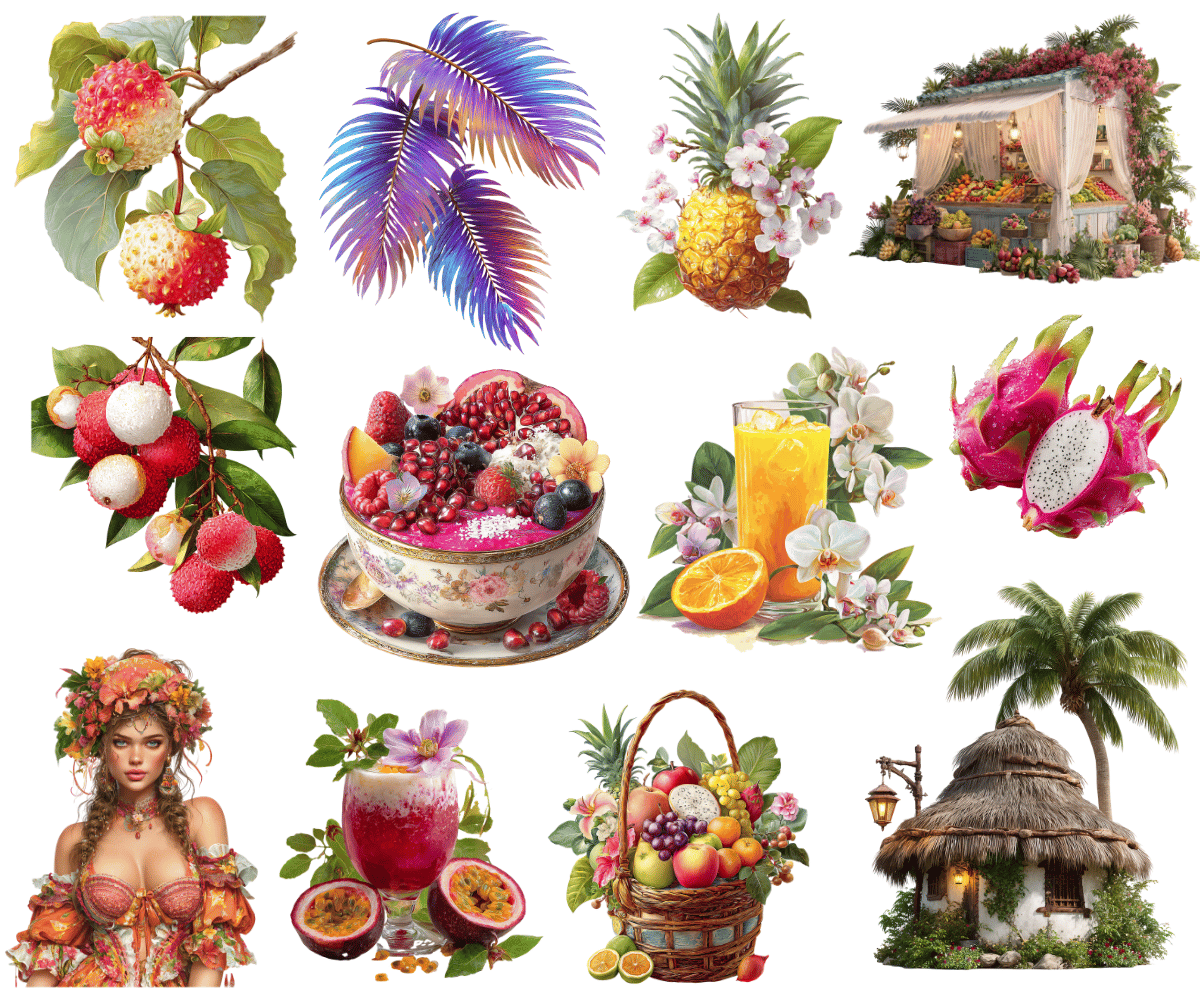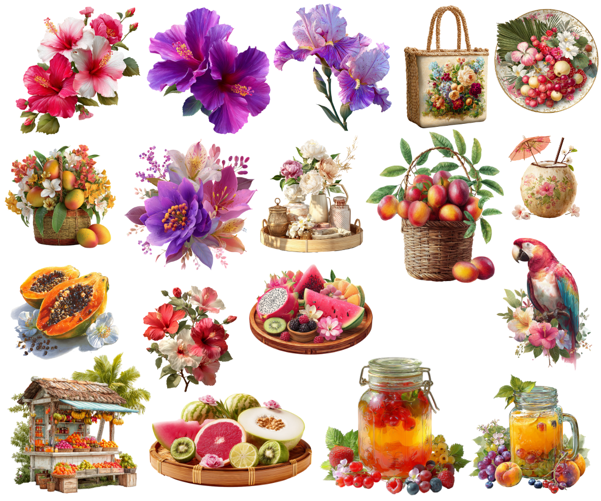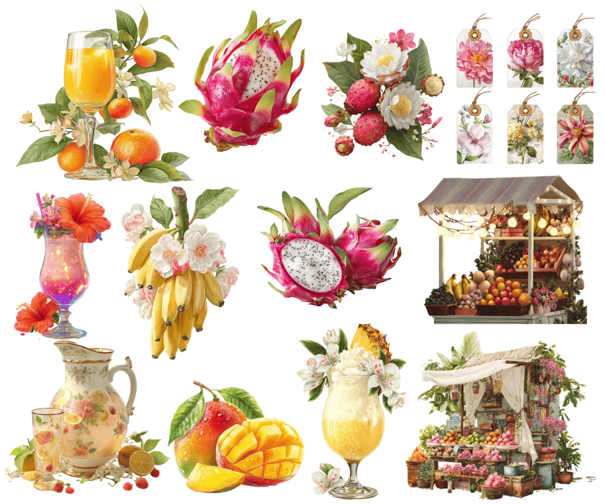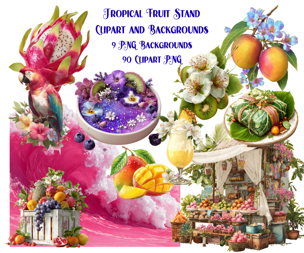 Elevate your crafting projects with our Tropical Fruit Stand Clipart and Backgrounds. Perfect for instant download and sublimation design. Clipart includes elegantly styled elements suitable for crafting projects in gorgeous rich tones evocative of the fruity and fresh aesthetic. Ideal for digital art, printable clipart, and crafting, this set is a must-have for creating charming arts and crafts designs. In fact, cut them out and place them on your planners to make for an extra special gift for an organizer.