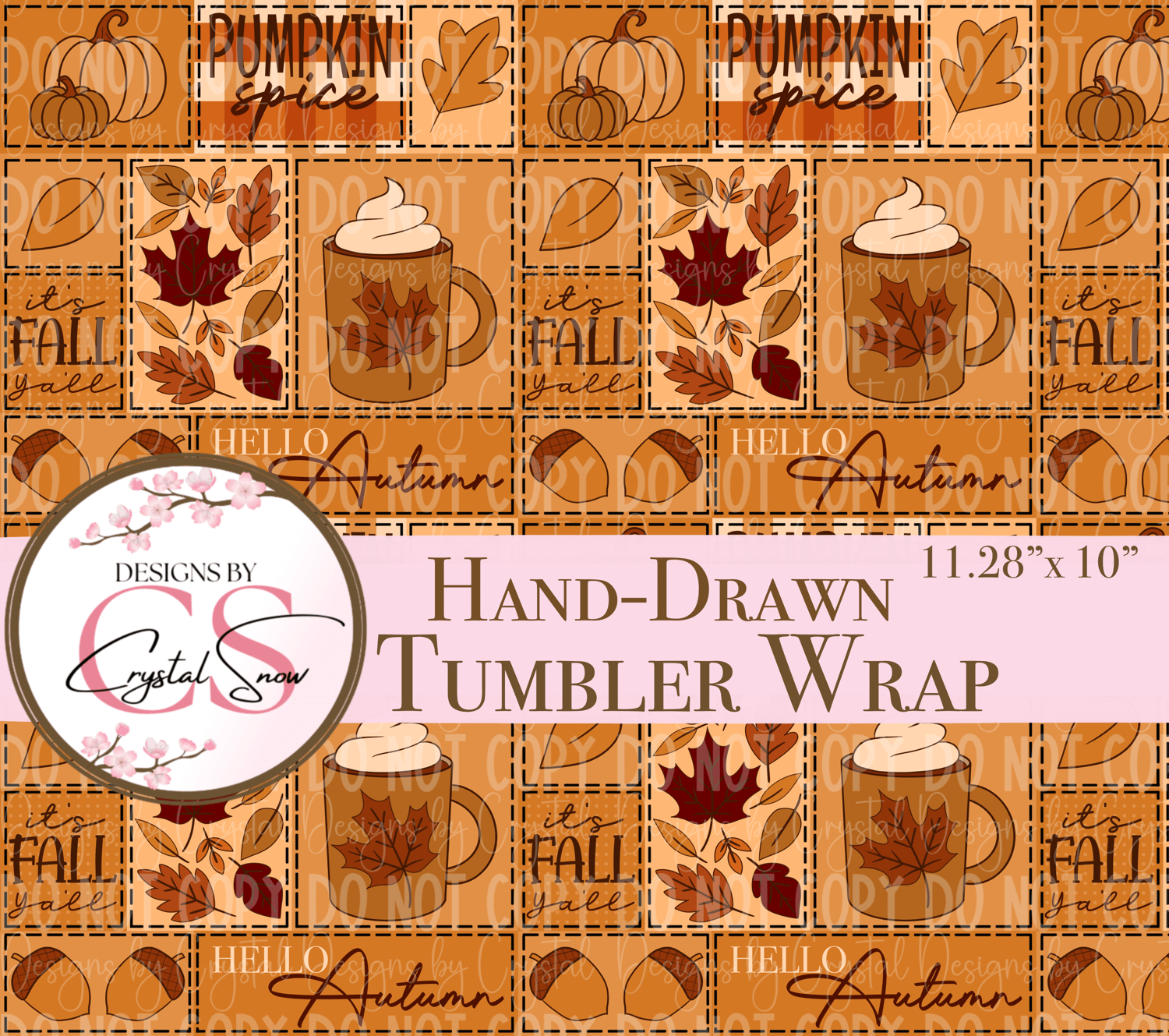 Celebrate your love for pumpkin spice season with this hand-drawn tumbler wrap featuring cozy fall patches — pumpkins, leaves, mugs of goodness, and autumn-inspired phrases. This high-resolution PNG is designed to fit most 20oz straight skinny tumblers (11.28”x10”), making it the perfect choice for creating your own seasonal drinkware.