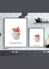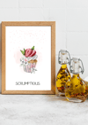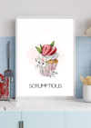 Beautiful Watercolor Cupcake on a Pink Background and Confetti with text: “Scrumptious”-Pretty Cupcake Art-Lovely Watercolor Cupcake-Cupcake Printables PDF-Kitchen Decor Ideas-Kitchen Decor Gifts-Kitchen Prints-Living Room Decor-Kitchen Ideas