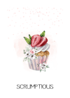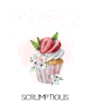 Beautiful watercolor cupcake on a pink background, confetti, and text “Scrumptious”. In pretty soft colors with a cute strawberry on top and decorated with pretty little tiny flowers and green leaves.