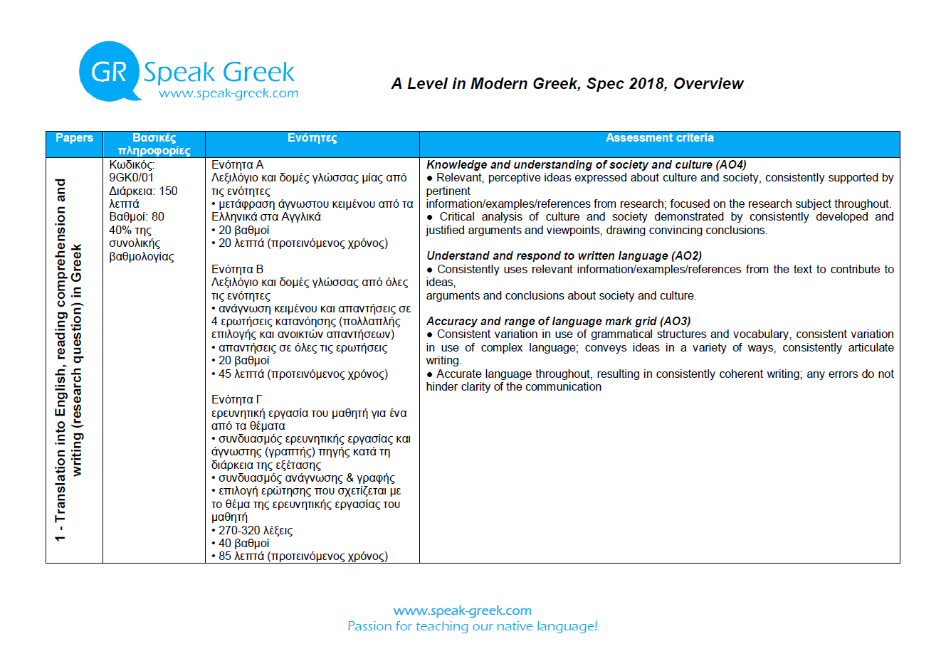 Download for free the overview of the exams for the A Level in Modern Greek.