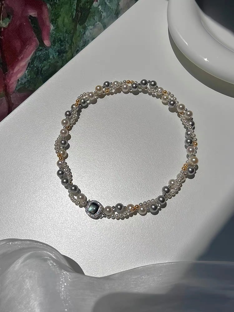 Vintage style micro-set square mother-of-pearl white double entwined layered pearls necklace