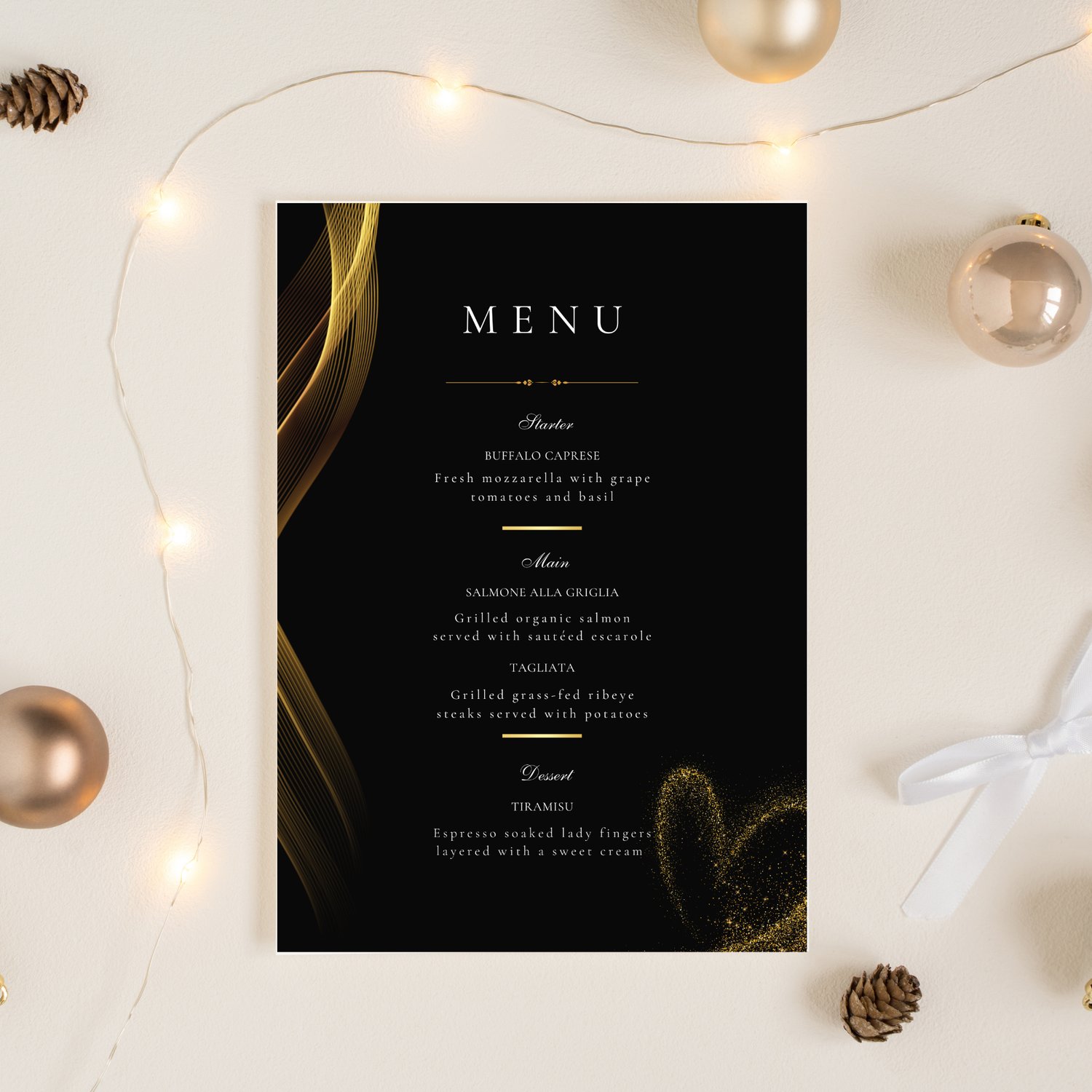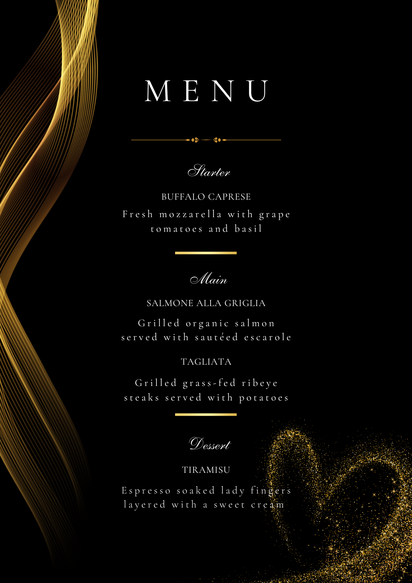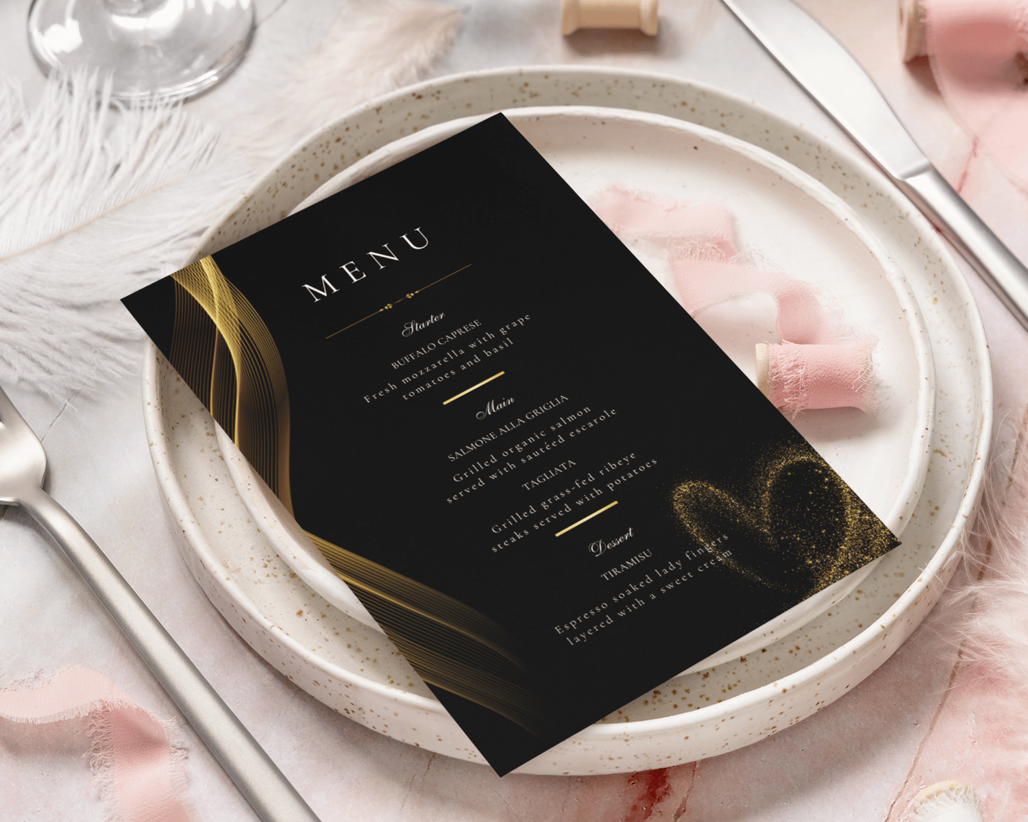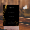 Bring a bold and luxurious vibe to your wedding table with the Black & Gold Wedding Menu – a striking, modern template featuring flowing golden lines, elegant serif typography, and a subtle heart-shaped shimmer for a romantic finishing touch. This menu design is perfect for formal evening weddings, black-tie celebrations, or any couple wanting a dramatic, high-end aesthetic.