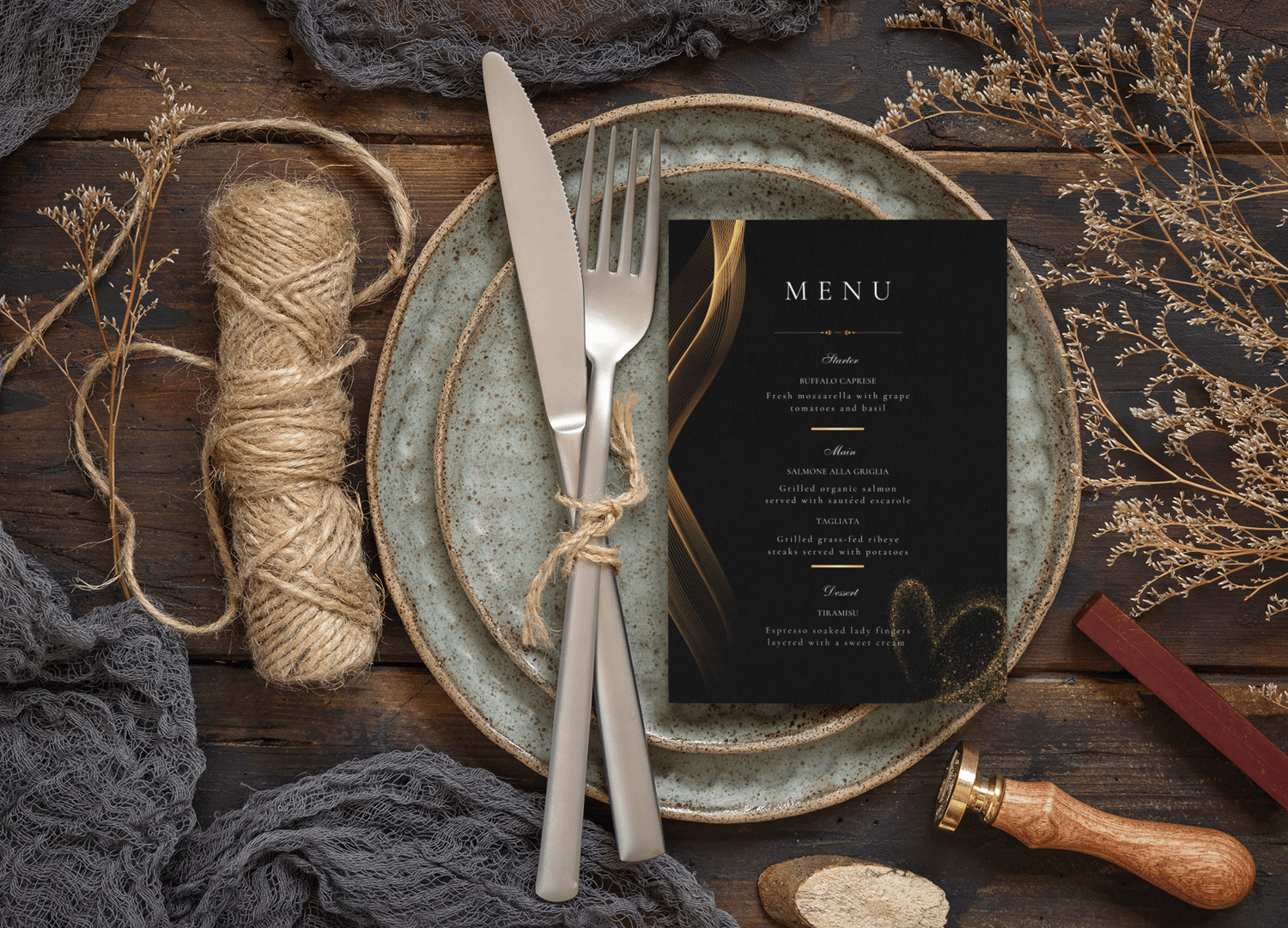 Whether you're hosting a chic city soirée or an elegant rustic dinner, this menu will elevate every place setting with timeless style and sophistication.