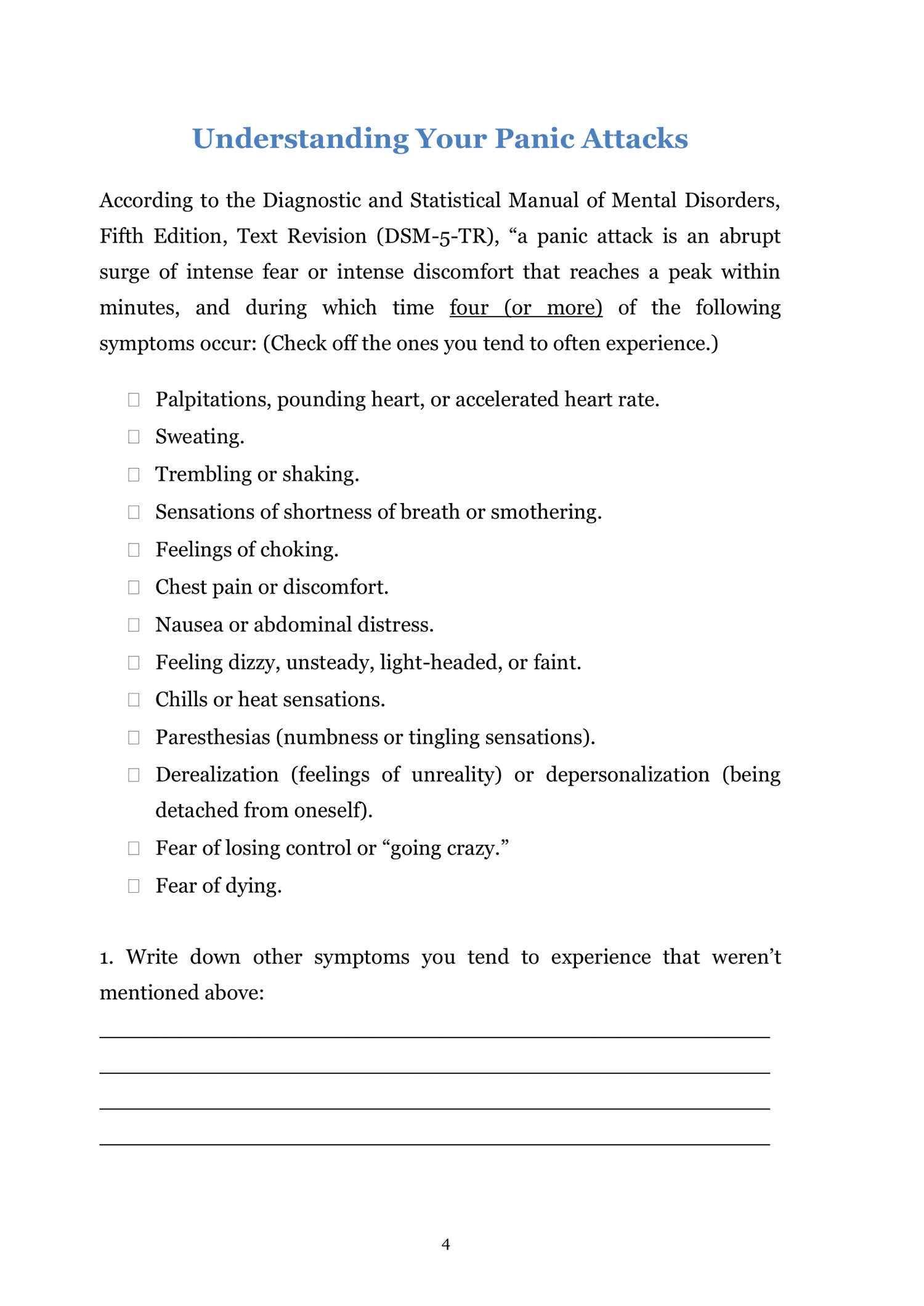 Each worksheet is designed to provide practical guidance and emotional support, helping you build confidence in managing panic attacks and reducing their frequency and intensity.