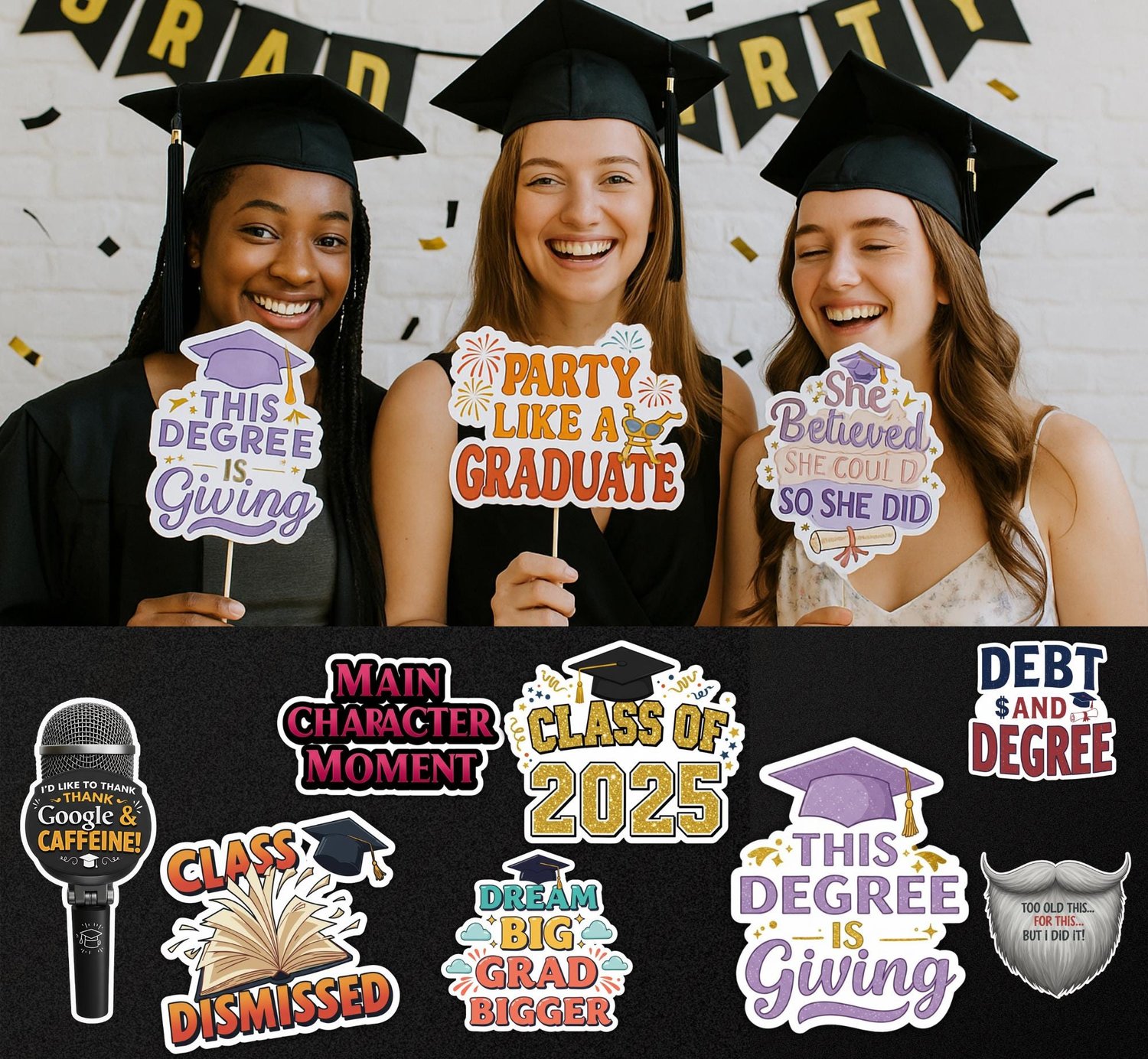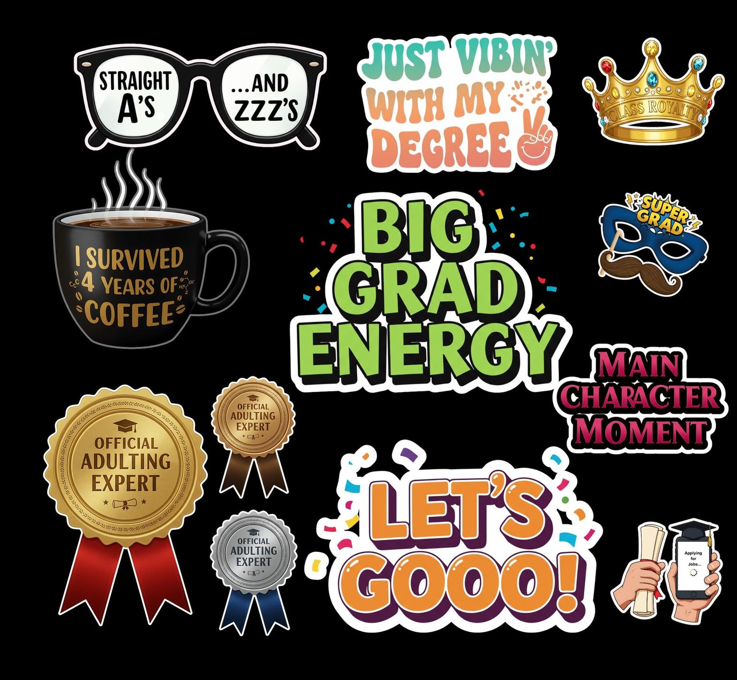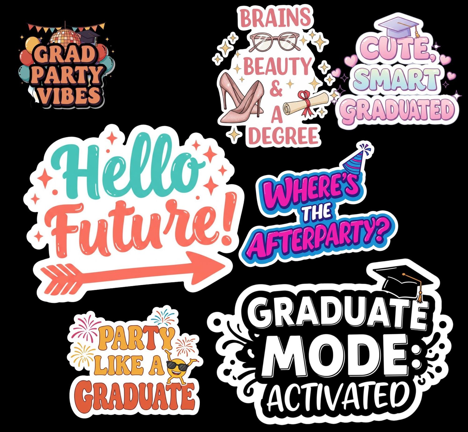 📣 Speech bubbles & fun phrases ("Class of 2025!" "Grad Vibes Only!")