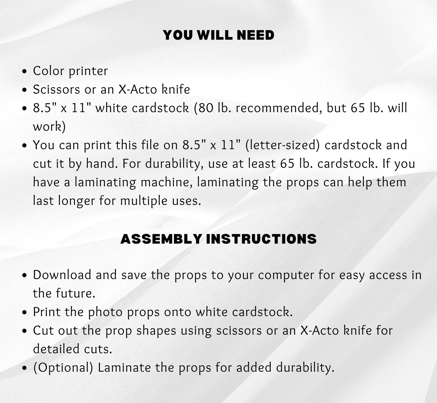 You can print this file on 8.5" x 11" (letter-sized) cardstock and cut it by hand. For durability, use at least 65 lb. cardstock. If you have a laminating machine, laminating the props can help them last longer for multiple uses.