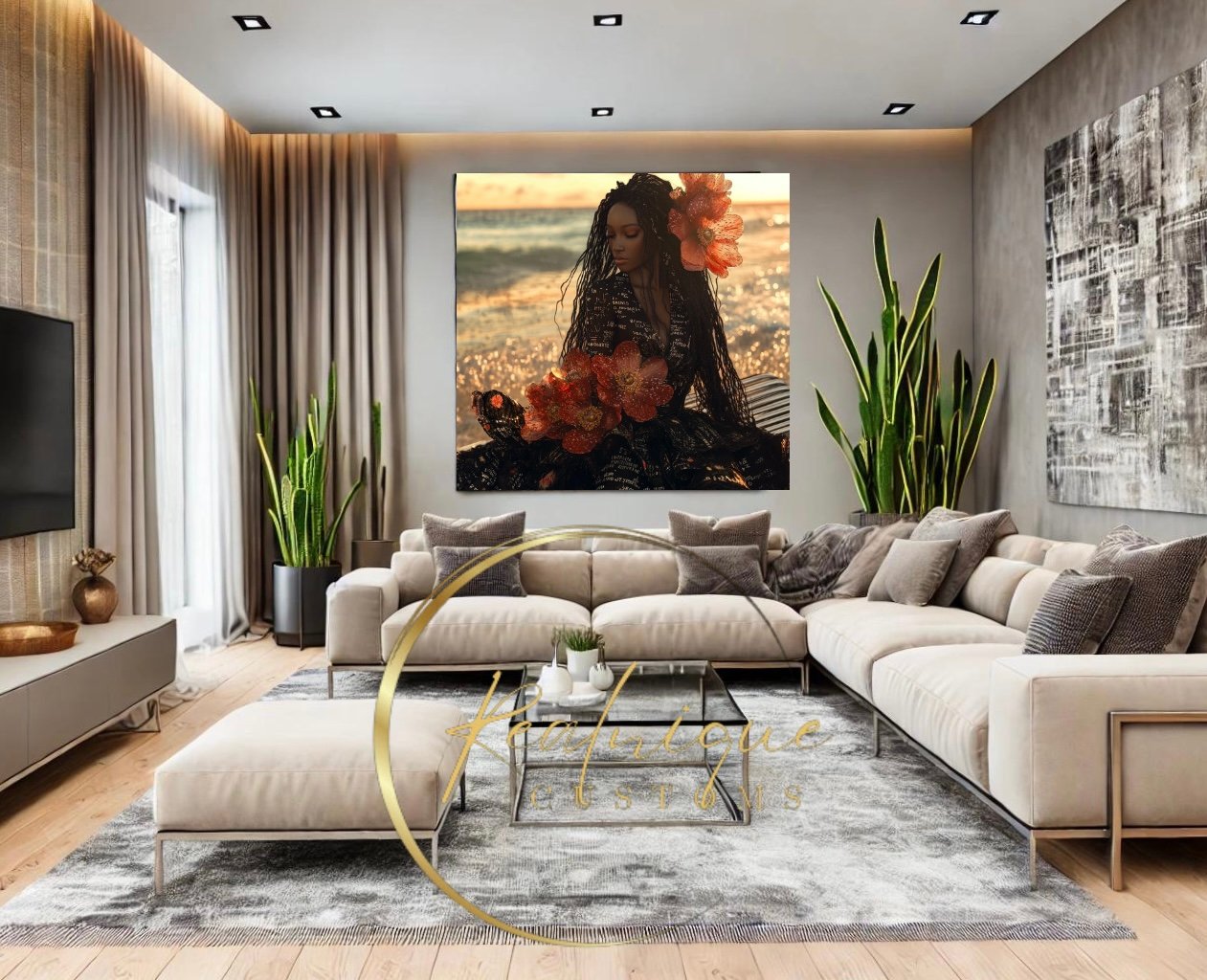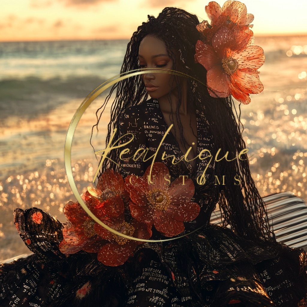 Bathed in the soft, golden light of the setting sun, this artwork features a serene woman seated by the ocean. Her flowing black hair, embellished with oversized vibrant poppy flowers, cascades down her shoulders. Her figure is woven with abstract text and digital patterns, yet remains organic and graceful. The warm hues of the sunset contrast beautifully with her dark silhouette, creating a tranquil and otherworldly atmosphere, where nature and technology seem to coexist in perfect peace.