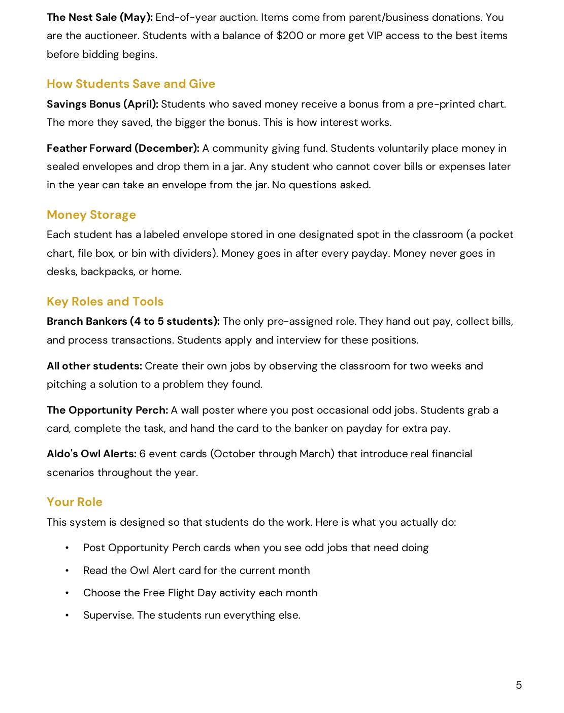 Printables Pack (18 printables): Aldo Allowance currency, pay stubs, student ledgers, Owl Eye Observer worksheets, banker applications, savings plan worksheets, Owl Alert event cards, Feather Forward giving slips, auction price tags, year-end reflection worksheets, classroom posters, and more.