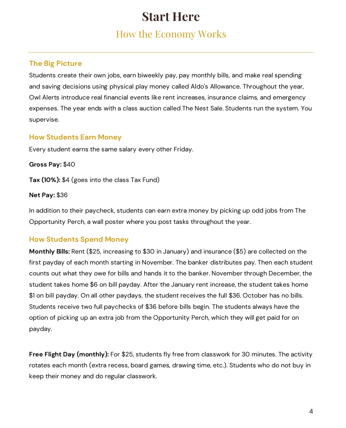 Students do not get assigned random jobs. They observe real problems in the classroom using an Owl Eye Observer worksheet, then pitch their own job solutions. Student bankers run biweekly payroll. Paychecks show gross pay minus taxes, just like the real world. Starting in November, students pay monthly rent and insurance. Savings earn interest. Students give to a class community fund. And throughout the year, Owl Alert events introduce real-world surprises like unexpected expenses, budget windfalls, and financial decision points that keep the economy feeling alive. The year ends with a class auction where every financial decision a student made all year long shows up in their balance.
