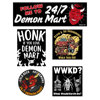 This is the complete 24/7 Demon Mart sticker pack, featuring all five stickers in the Demon Mart universe. You get one of each sticker.