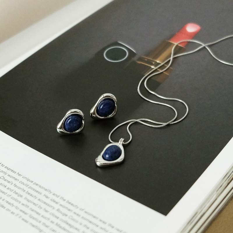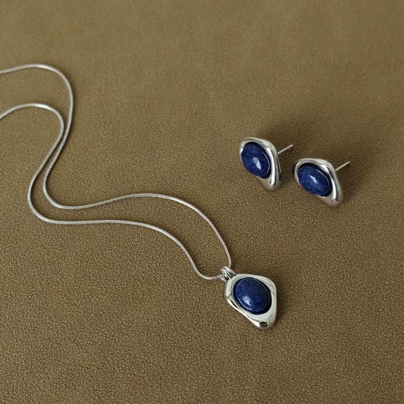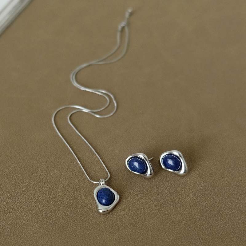 Retro exquisite artistic chic natural lapis lazuli irregular small stud earrings necklace set