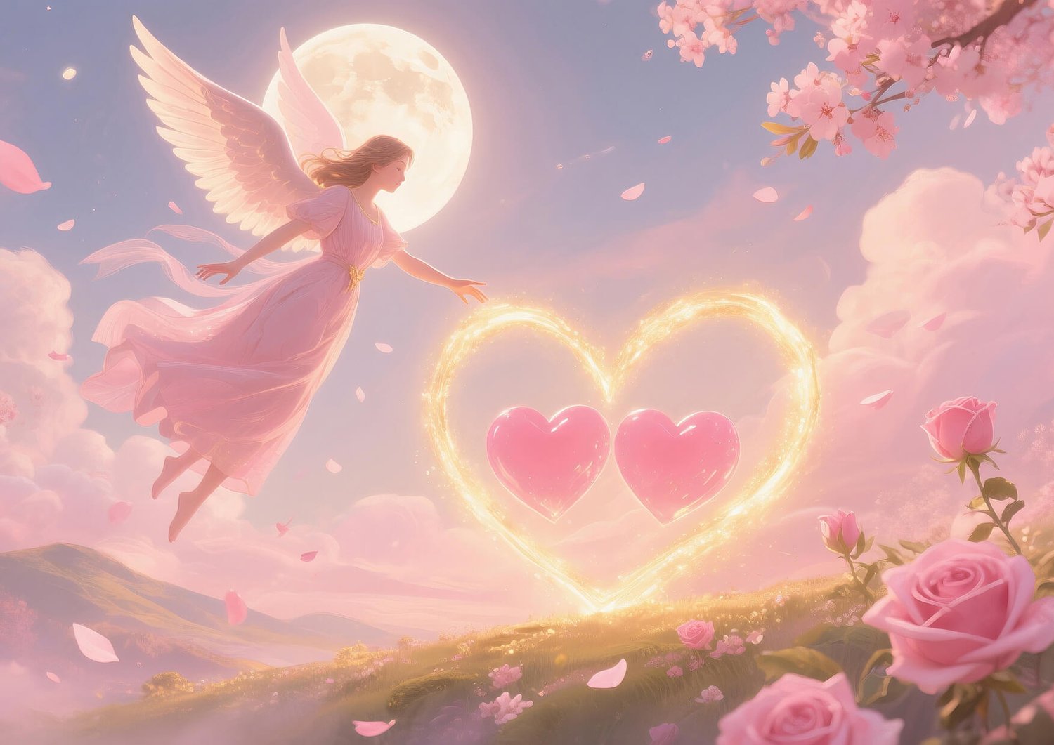 With soft pink and red tones, and featuring roses and heart motifs, it symbolizes emotional openness and the attraction of love and connection.
