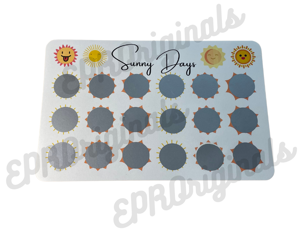 We've always been told to save for a rainy day, but what about the sunny ones? This scratch off savings challenge will shine a light on your savings. There is safety in knowing that you save $5, $10, or $15. Size is 8.5 in x 5.5 inches. There are 4 different cards. Which one will you get?