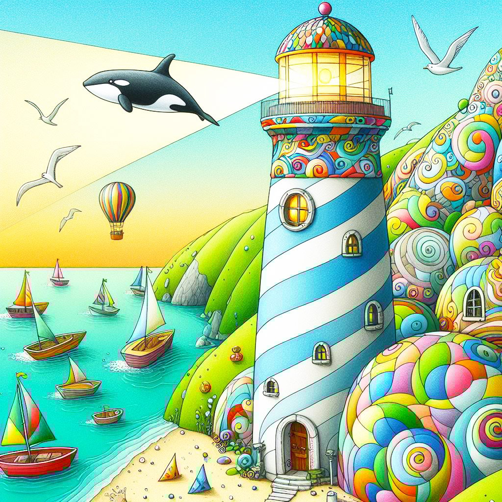 Colourful patterned lighthouse shining a light beam. Boats ride in a turquoise sea. There are whimsical houses made of swirly patterned marble on high hills & coloured pebble pathways. There is a beach & a killer whale leaping from the water & seagulls fly in the sky. There are hot air balloons.
