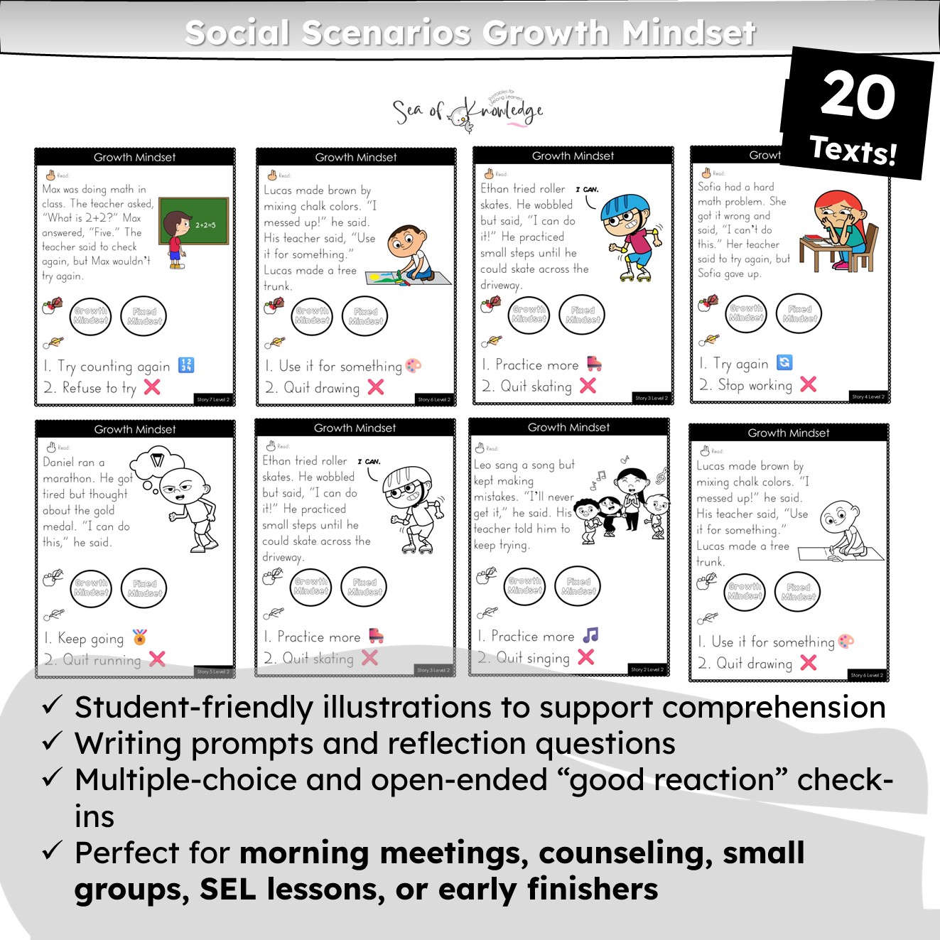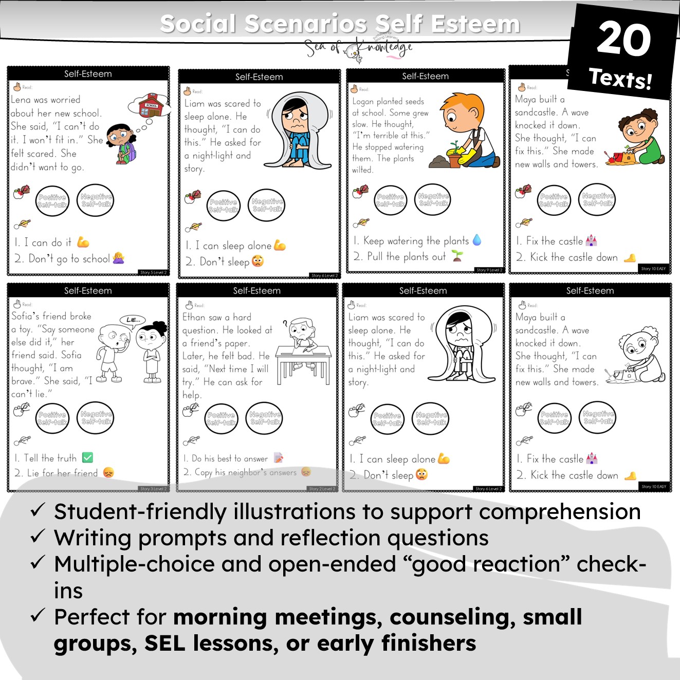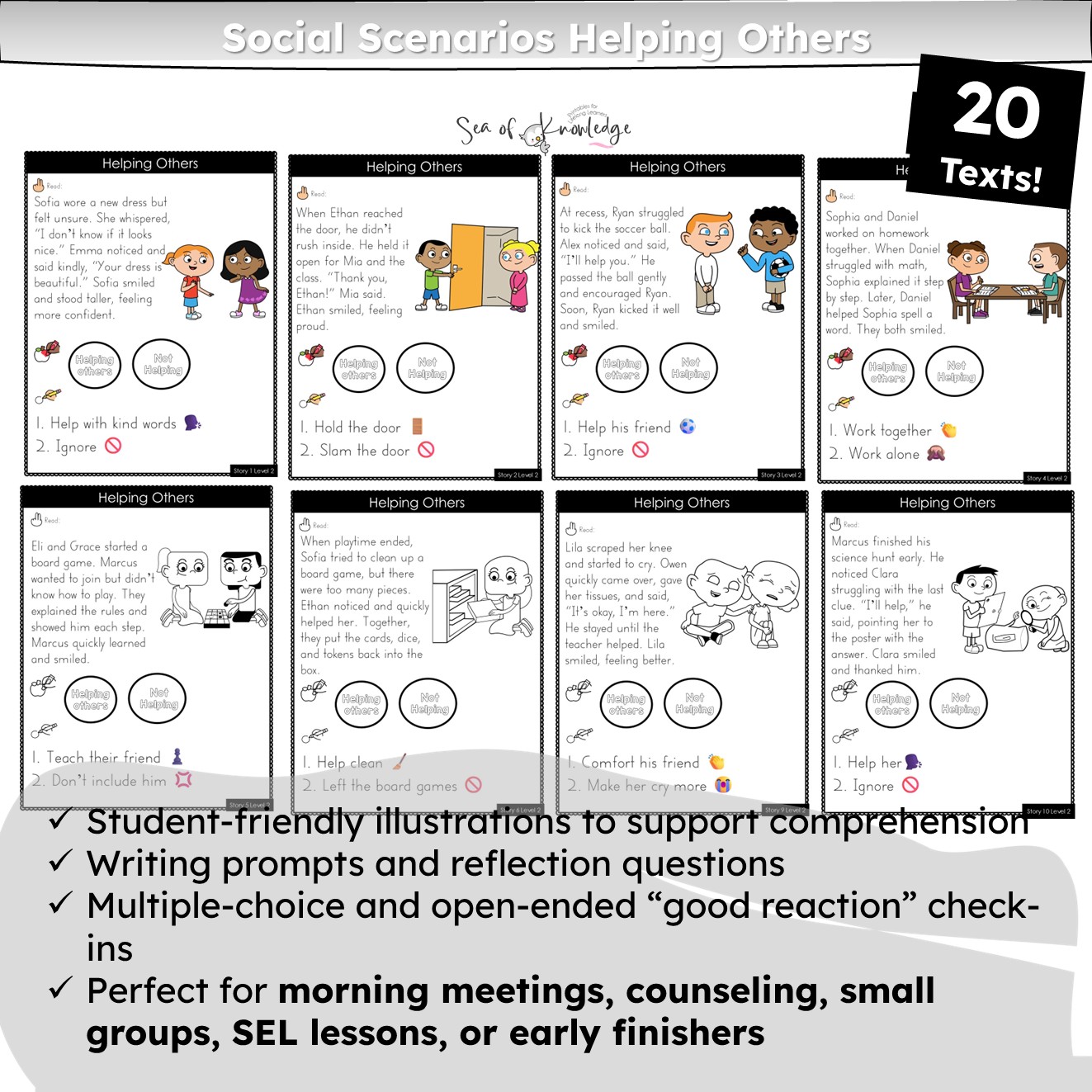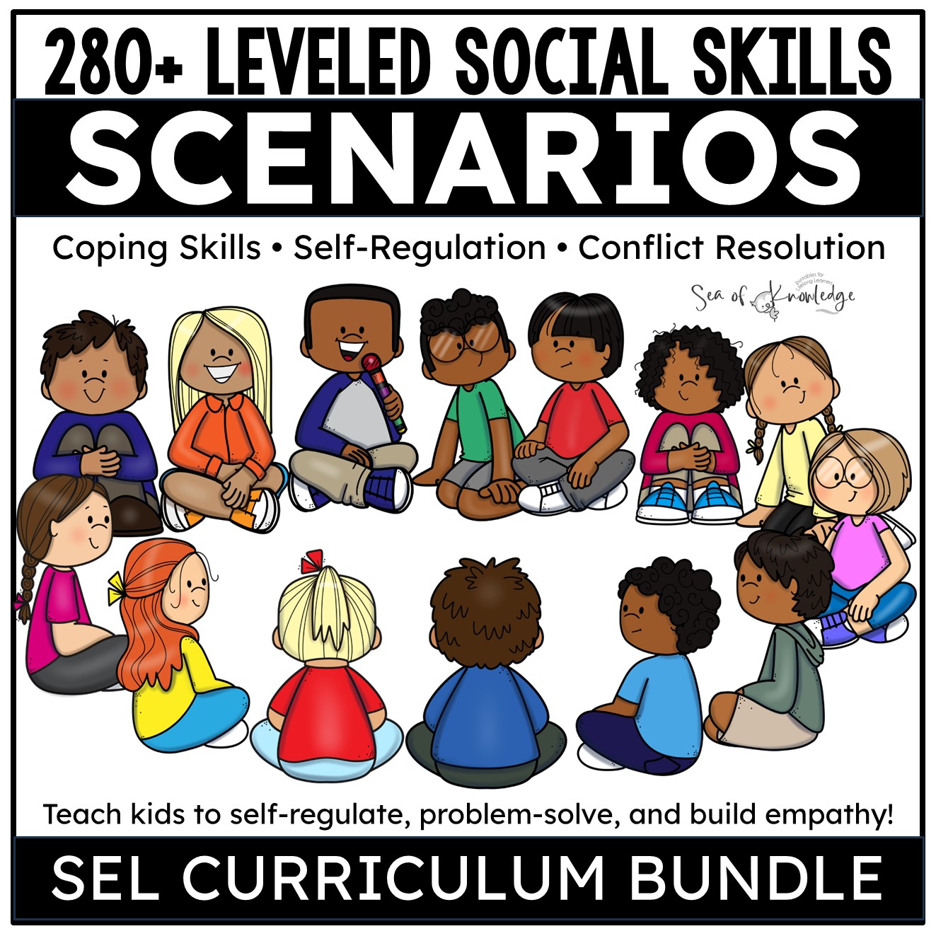 social skills scenarios, social scenario cards, behavior scenario cards, social emotional learning activities, SEL worksheets, social stories for kids, conflict resolution worksheets, coping skills activities, emotional regulation worksheets, problem solving for students, classroom management SEL, special education social skills, counseling activities for students, social skills lessons elementary, empathy lessons for kids, turn-taking activities, taking turns social story, growth mindset social stories, self-esteem worksheets, kindness activities for kids, decision making worksheets, responsibility social skills lessons, respecting others SEL, calming down strategies for kids, behavior management worksheets, small group SEL activities, printable social emotional learning, leveled social stories SEL, social emotional activities for counseling, emotion scenarios for students, community building SEL lessons, helping others activities, making mistakes social story, expressing emotions worksheets, SEL scenario mega bundle.