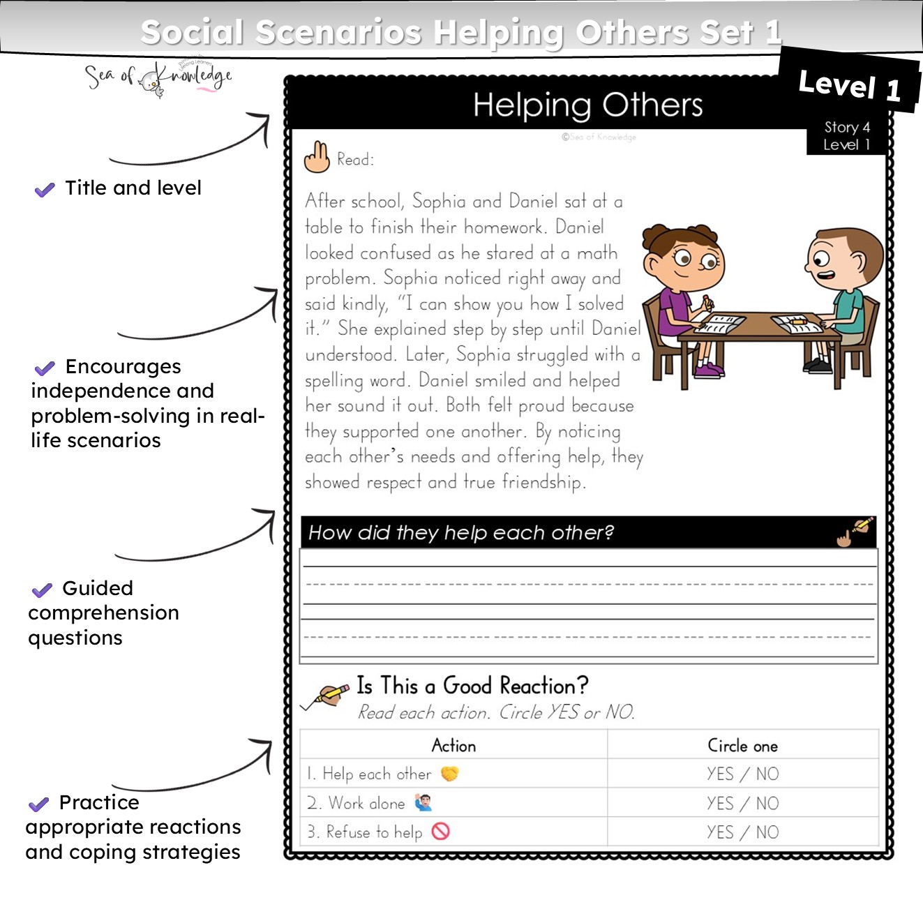 You’ll get 14 complete units of Social Skills Scenarios, each with leveled texts and activities: