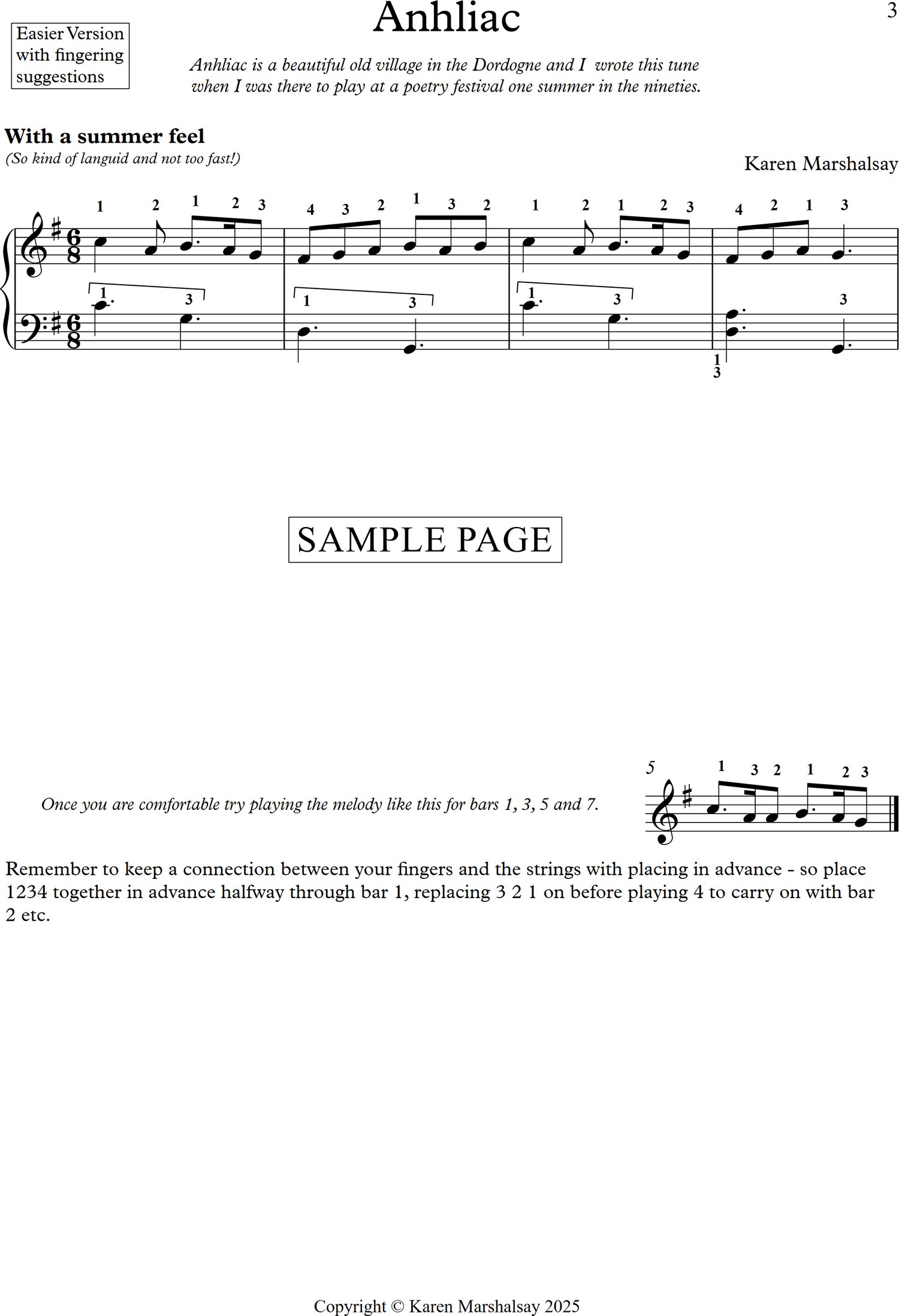 Key of G, 6/8, left hand features octaves, rolled chords, 3rds and separate note runs. The easier version has single notes and triads.