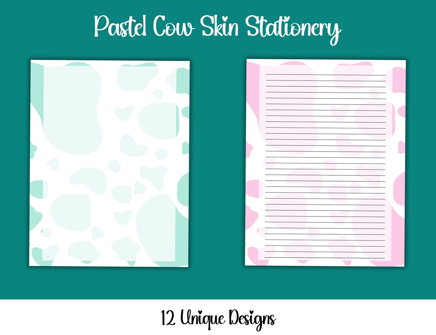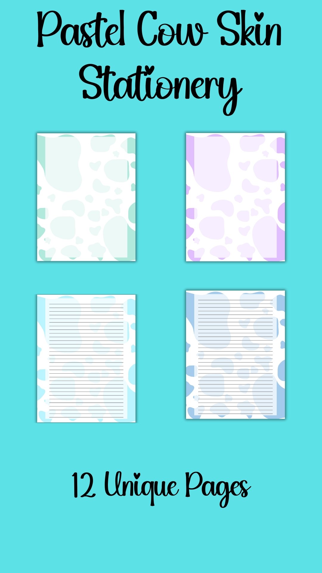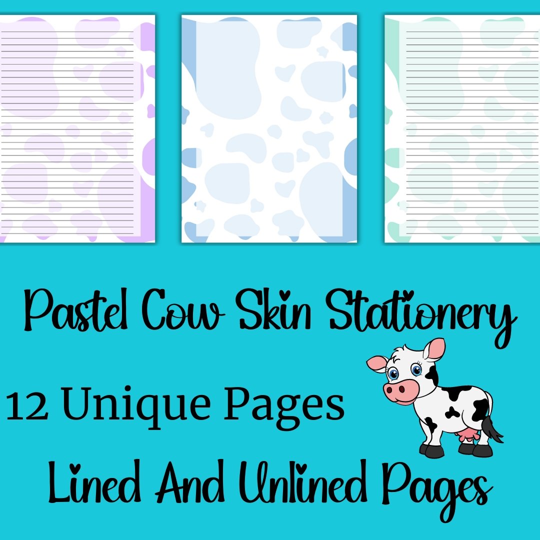Note: This is a digital download. No physical item will be shipped. You'll recieve 12 unique sheets of Pastel Cow Penpal Paper.