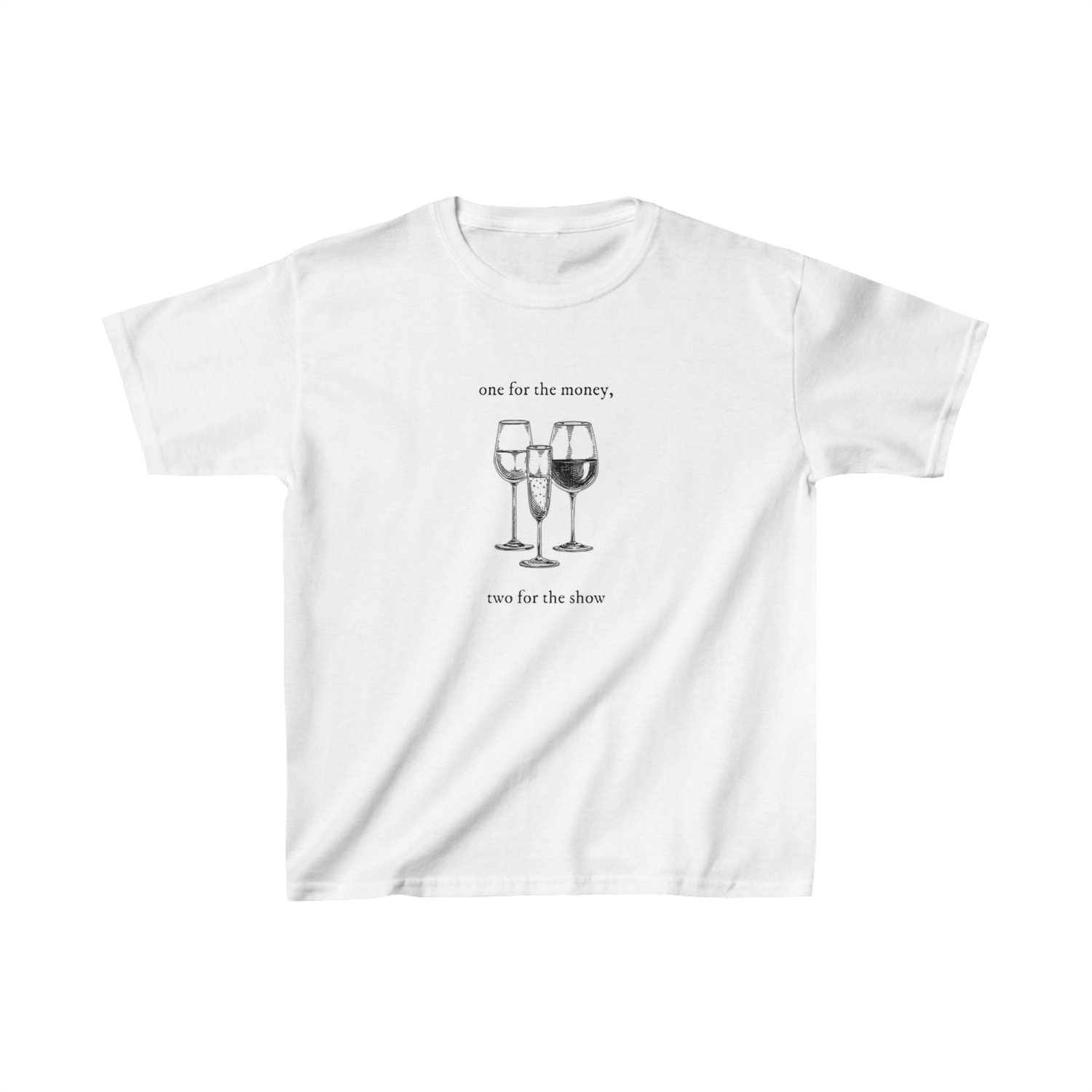 Champagne problems lyrics printed on a lightweight 90s style baby tee.