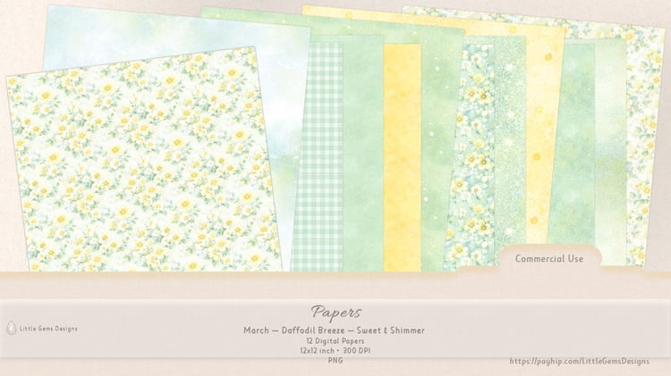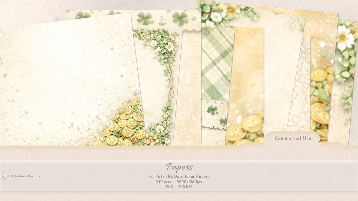 This set features soft vintage backgrounds with clovers, florals, lace details, and golden coin accents in warm green and cream tones. Perfect for layering, journaling, card making, and scrapbook designs.