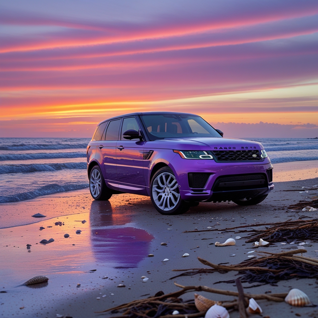 A stunning metallic violet Range Rover Sport parked on a serene beach at low tide, with gentle waves lapping at the shore, as a breathtaking sunset unfolds in the background, casting a warm orange-gold light across the scene. The luxurious SUV's sleek, angular lines and gleaming violet finish appear radiant against the vibrant hues of the sky, where soft pink and purple clouds are streaked across the horizon. The beach itself is lined with scattered shells and seaweed, with a few driftwood sticks strewn about, creating a sense of rustic serenity. In the distance, the sun dips below the horizon, leaving a trail of fiery colors that reflect off the Range Rover's metallic surface, creating an eye-catching contrast between the man-made beauty and the natural wonder of the setting.