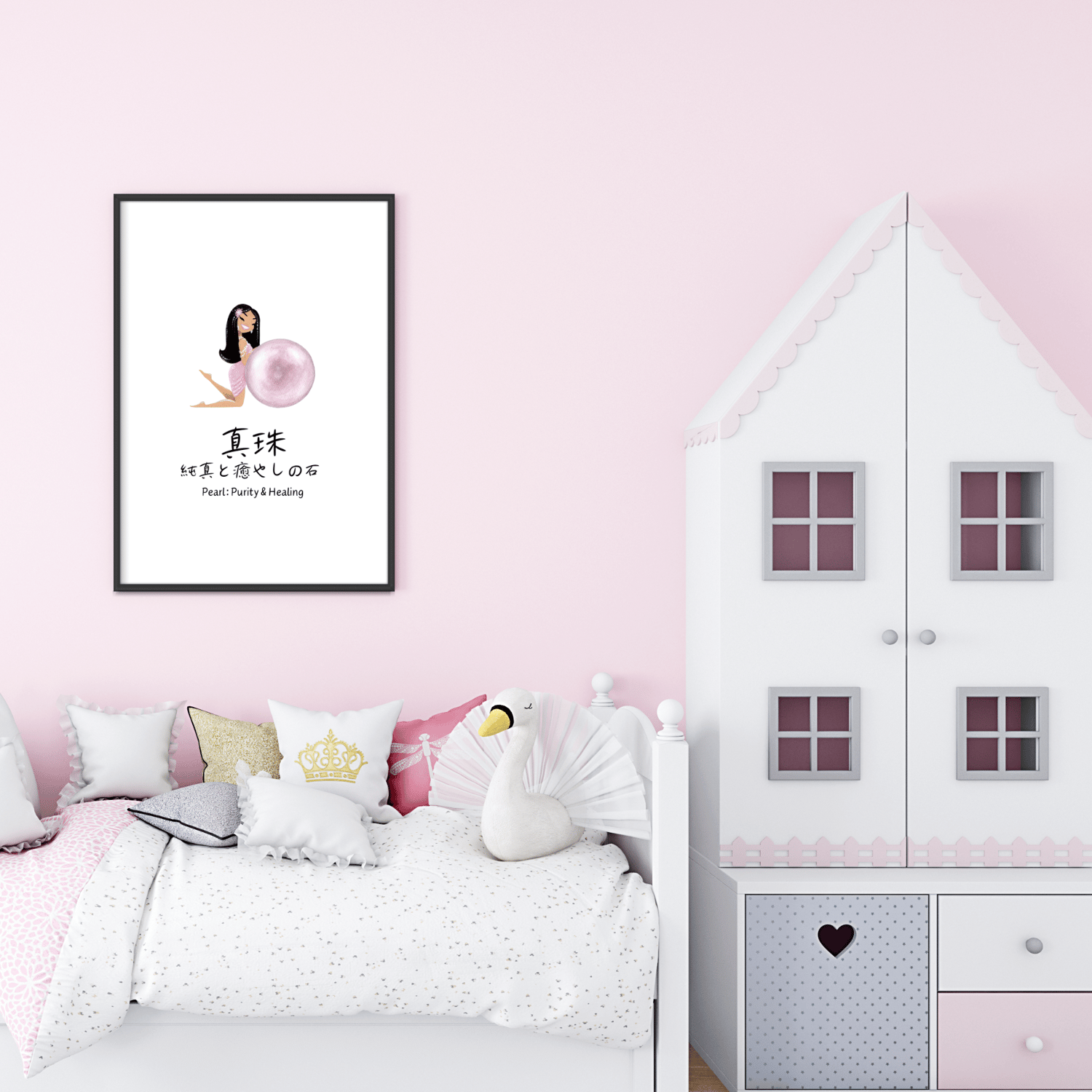 This beautiful wall art features an elegant illustration of June’s birthstone, the pearl. Accompanied by the meaning of the pearl in both English and Japanese, this piece adds a sophisticated touch to any room. Perfect for girls’ and women’s room decor, it brings a sense of style and grace.