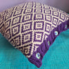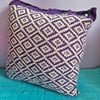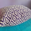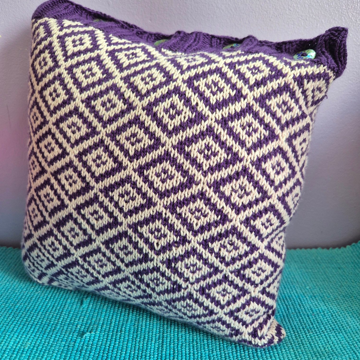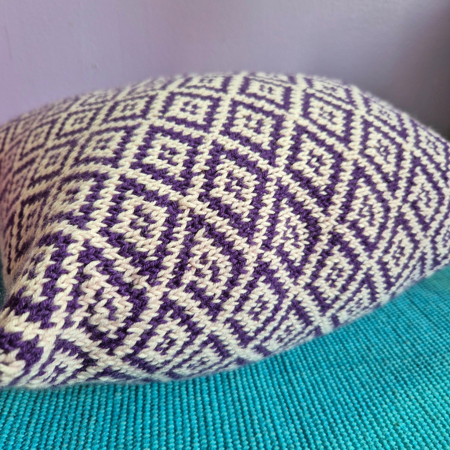 A fabulous stranded colour work cushion cover featuring a diamond pattern which is easy to follow. The cushion is worked in the round and finished with a rib button band.