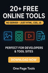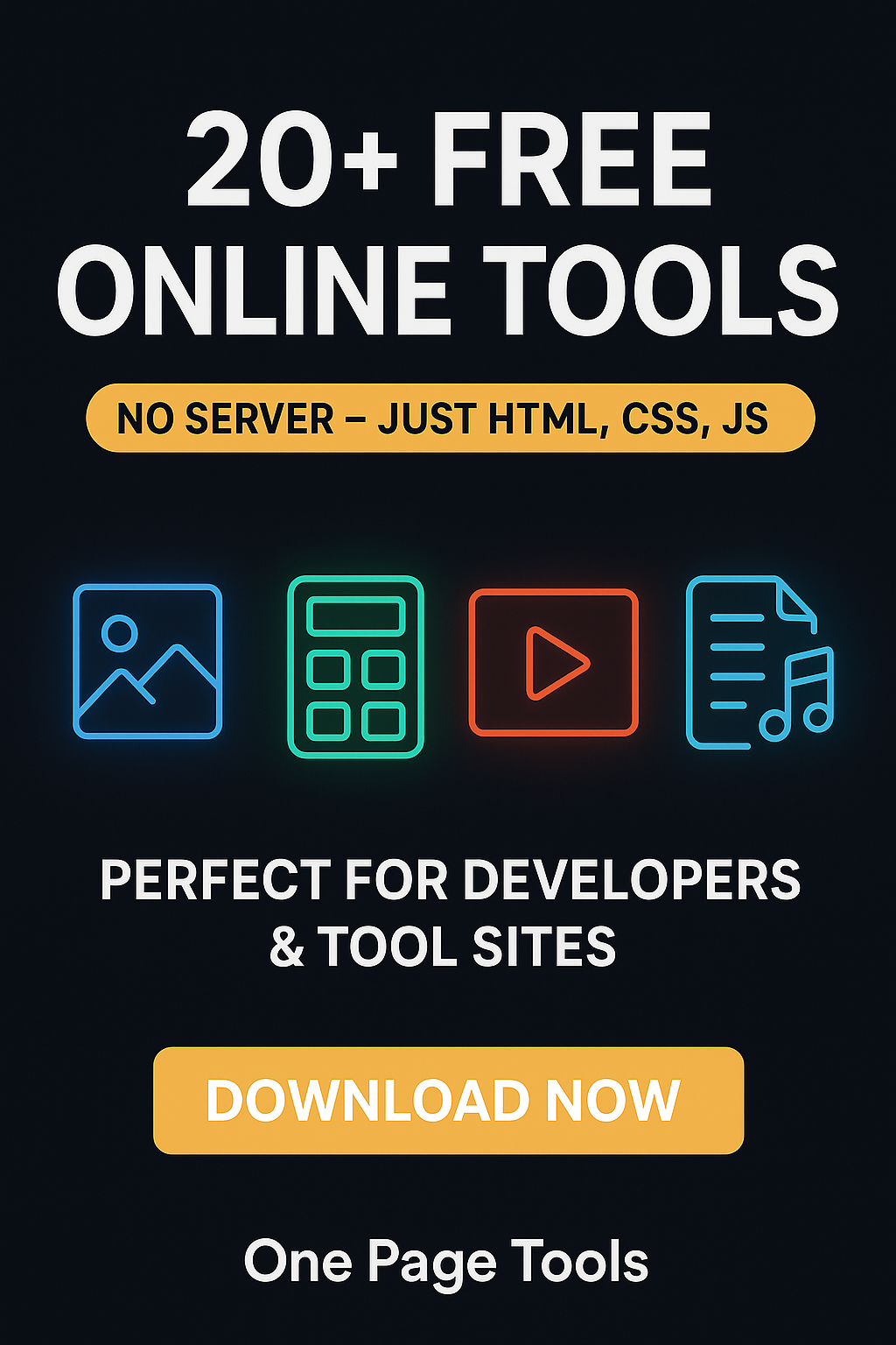 The One Page Tools pack includes 20+ ready-to-use online tools, fully responsive, no database, and 100% client-side (no server required). Perfect for developers, freelancers, bloggers, or entrepreneurs who want to launch their own tools website.