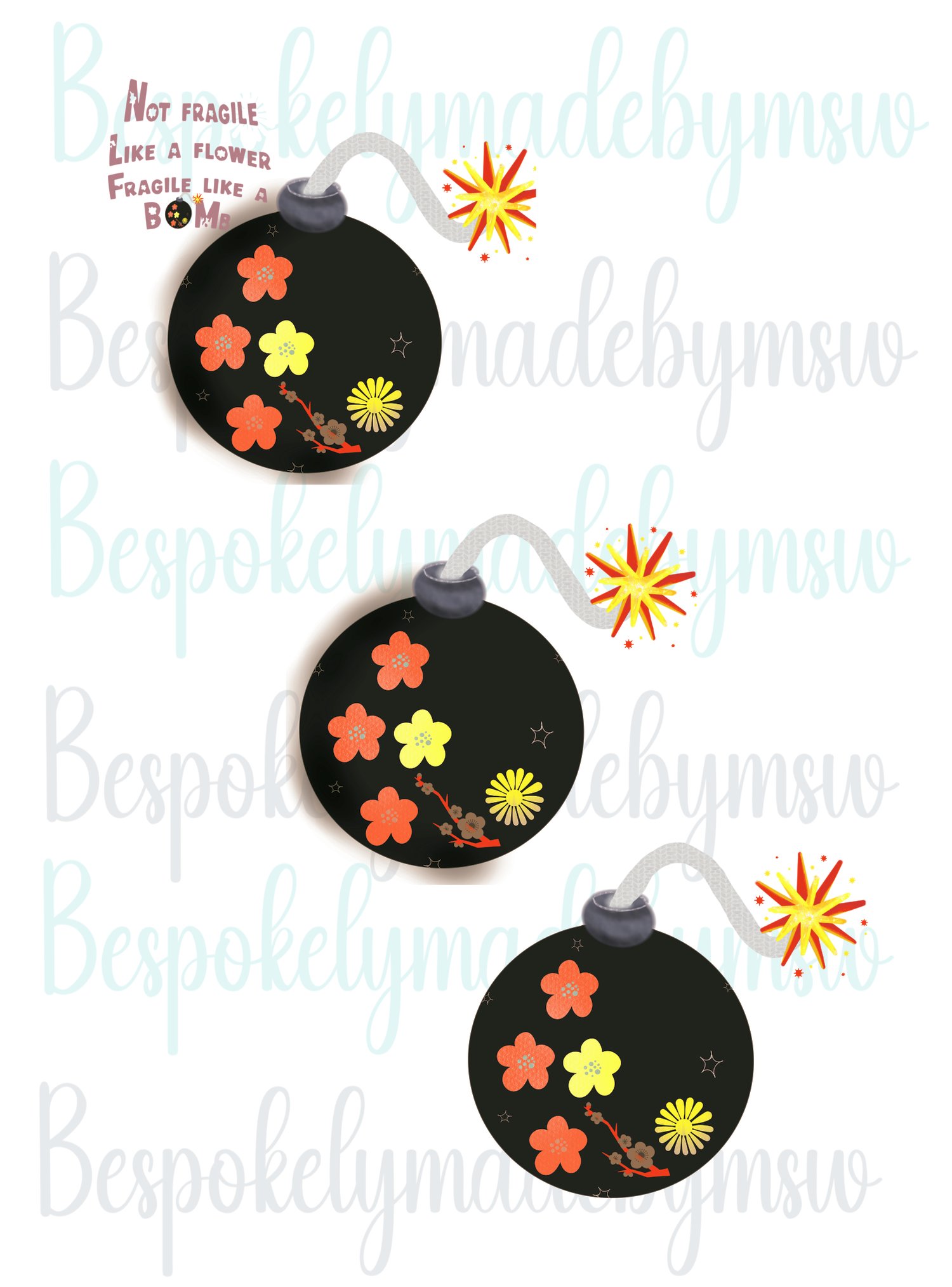 Not fragile like a flower, fragile like a b@mb design. These designs are hand drawn by myself. You get three different designs. One with writing, one plain with a shadow and one plain without shadow for you to add your own saying too in your own style. Can be resized in your software.