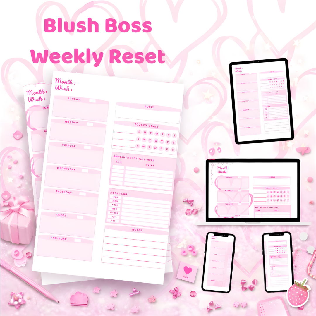 The Blush Boss Weekly Reset Planner is your go-to printable for planning your week with clarity and style. Designed with a clean layout and dreamy pink aesthetic, it helps you map out your schedule, set goals, track appointments, plan meals, and stay on top of everything—all in one place.
