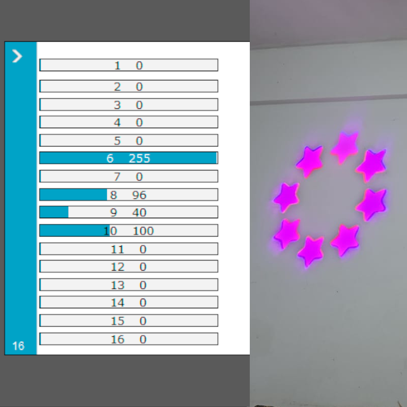 * Verifique, con un Fixture de pruebas (click), que coincidan estos canales: 6 Dimmer, 8 en el valor 96 = Color Magenta, 9 en el valor 40 = Gobo de estrella, 10 Prisma (ver tercer foto).