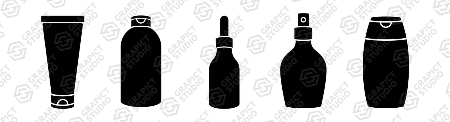 Cosmetic container icon set of 5, stylist design element, flat solid glyph, vector design template. Cosmetic container icon related to cosmetic, body care, skin care, perfume, body lotion, or shampoo.