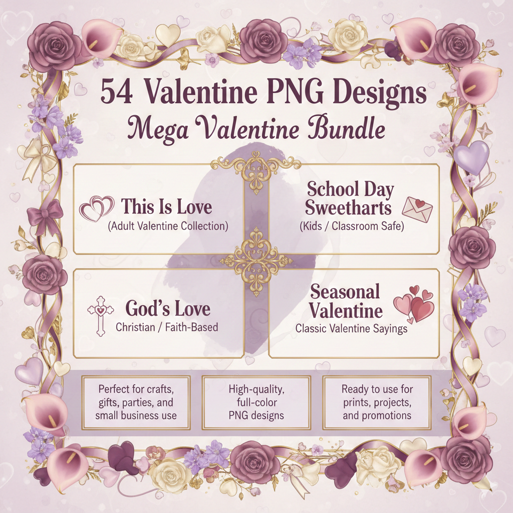 This bundle is perfect for creators who want variety, flexibility, and value — covering adults, kids, faith-based designs, and classic seasonal Valentine phrases all in one download.