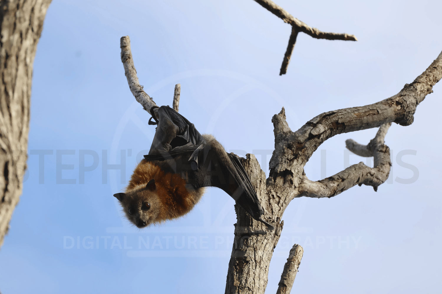 Captured mid-hang, this flying fox twists around to meet the lens with an inquisitive gaze, his wings folded neatly behind him. Set against the vibrant blue sky, his curious expression and unexpected pose capture the personality and gentle charm of this often misunderstood species. A playful reminder of the intelligence and individuality found in the treetops.
