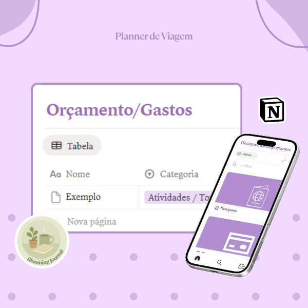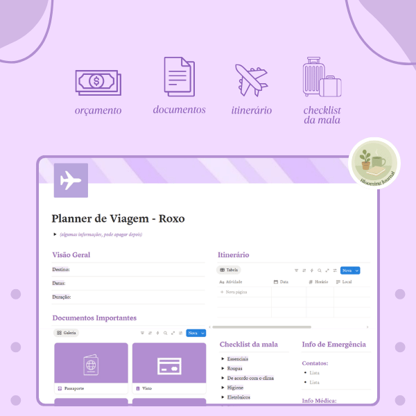 Este template reúne as principais informações de uma viagem em um único espaço dentro do Notion, ajudando a acompanhar planejamento, documentos e detalhes importantes antes e durante a viagem!