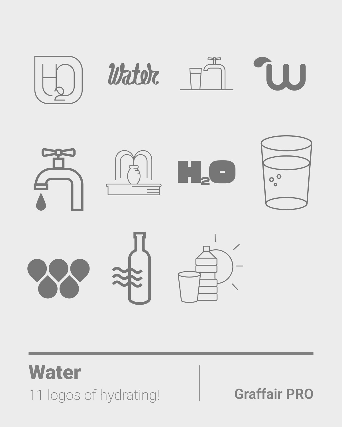 Water: 11 (eleven) monochrome vector logo designs of cool water. Amongst them, you can find letterings, monograms, and pictograms of the hydration element.