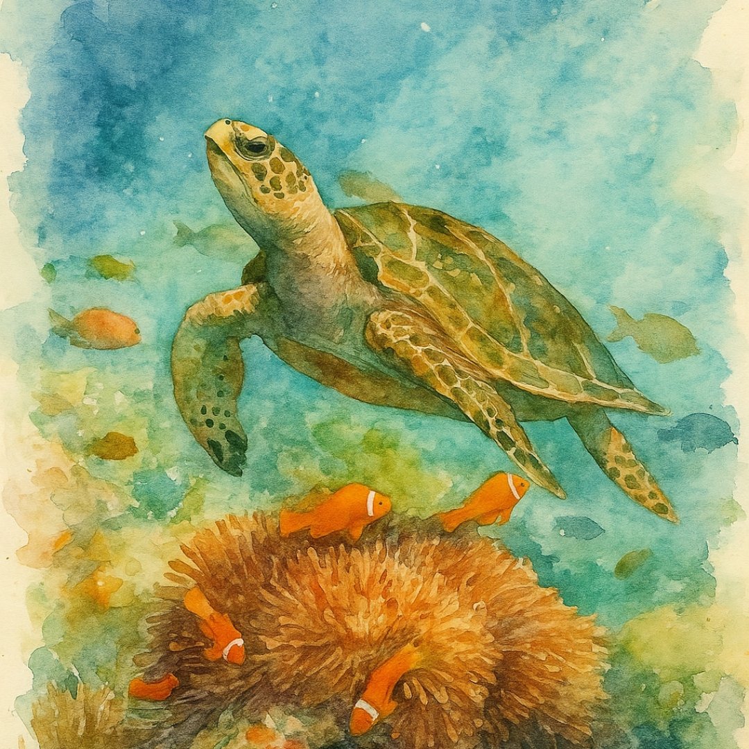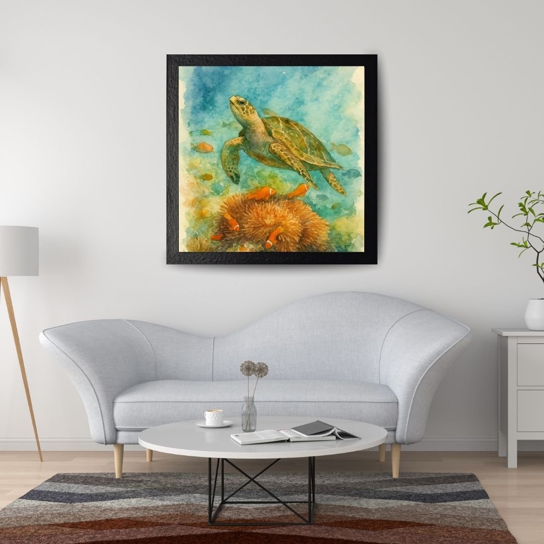 This breathtaking watercolor sea turtle painting is more than just wall art—it’s a window into tranquility. Imagine glancing up from a stressful day and instantly feeling transported into the calm, vibrant depths of the ocean. The gentle sea turtle gliding effortlessly above the coral, surrounded by playful clownfish, becomes a daily reminder to breathe deeper, slow down, and find peace in the present moment.