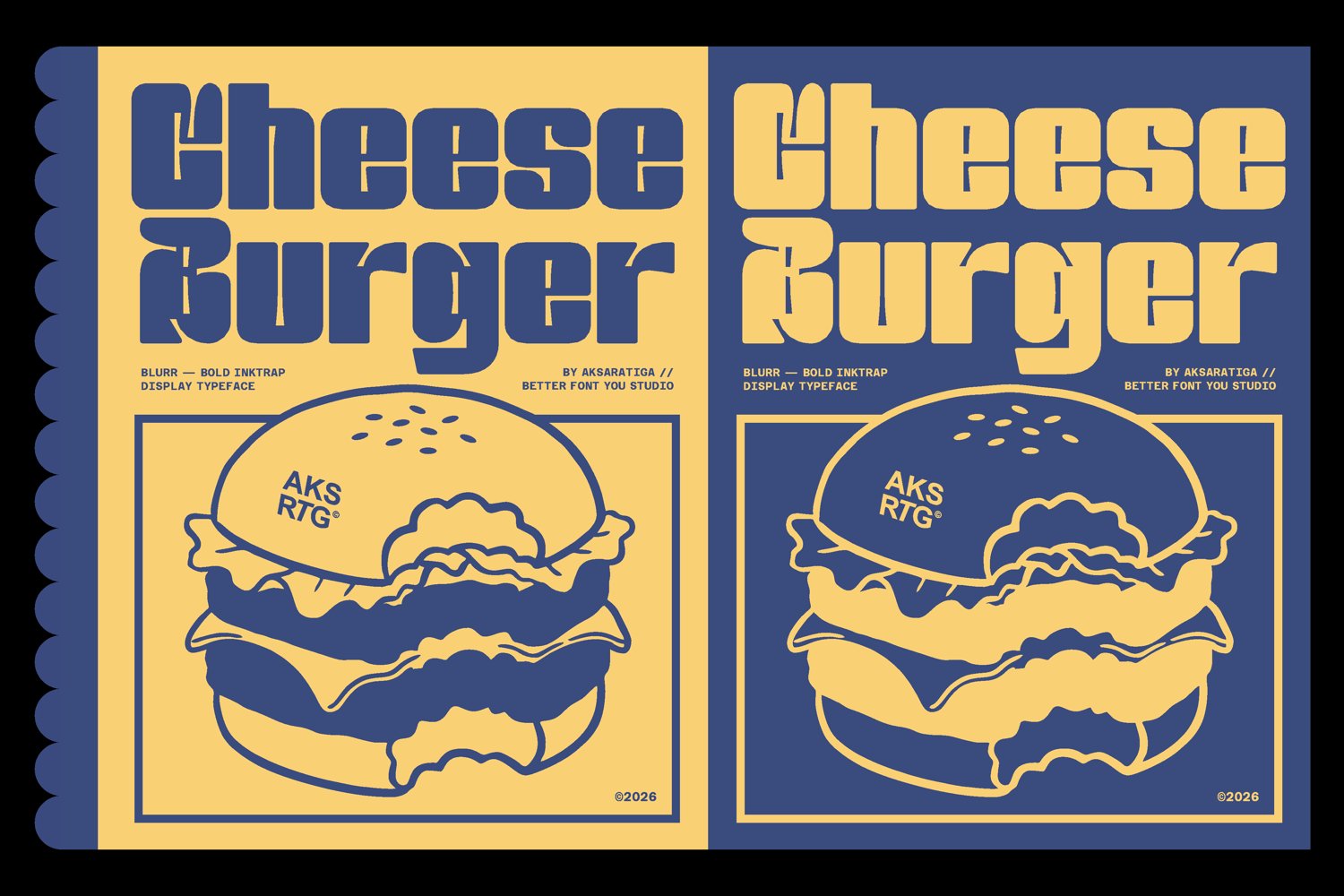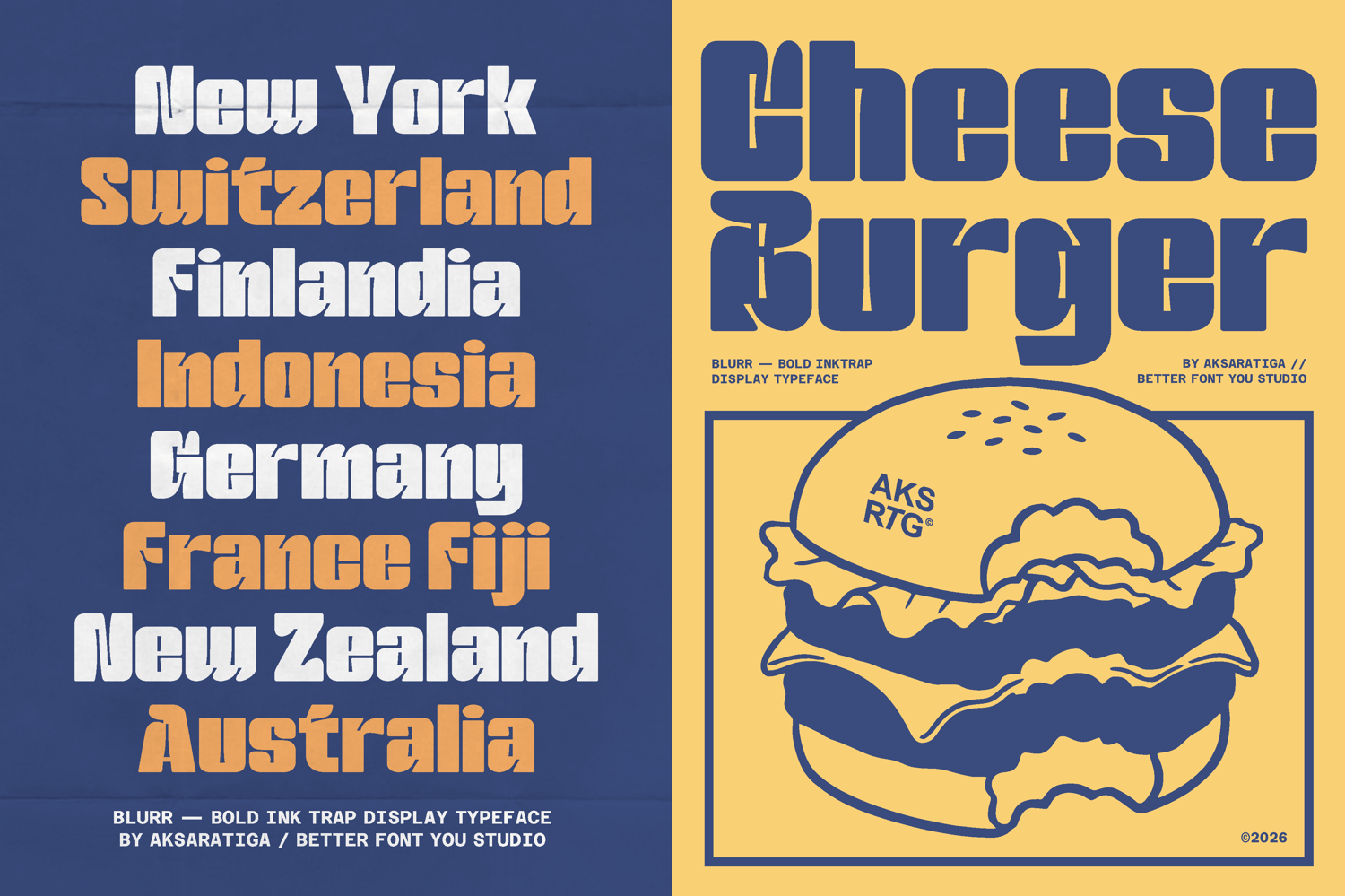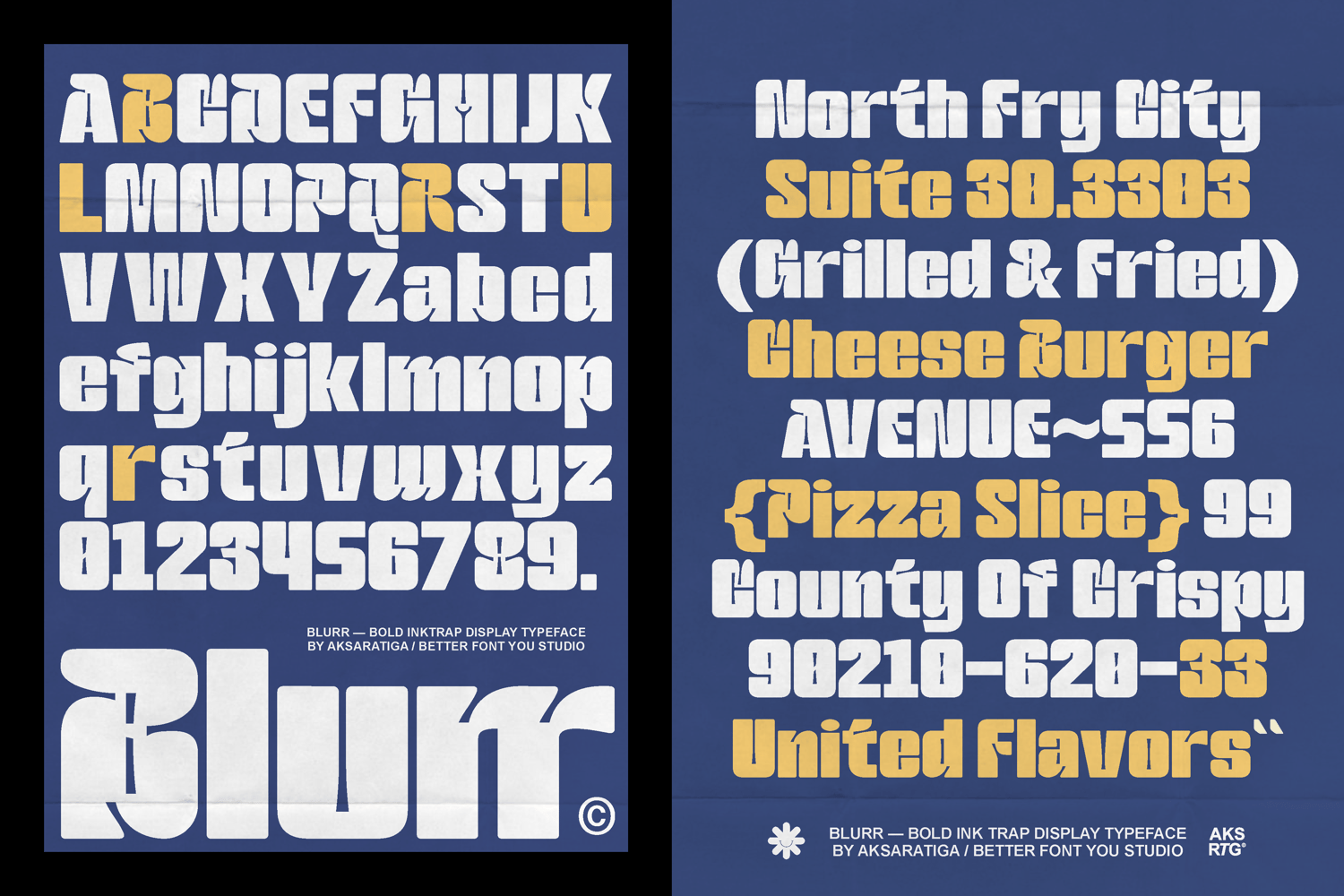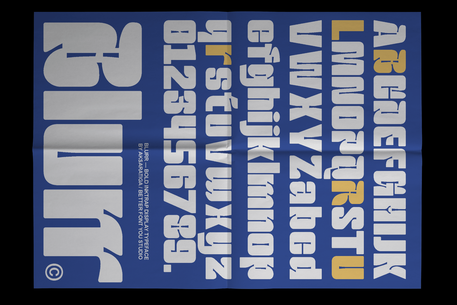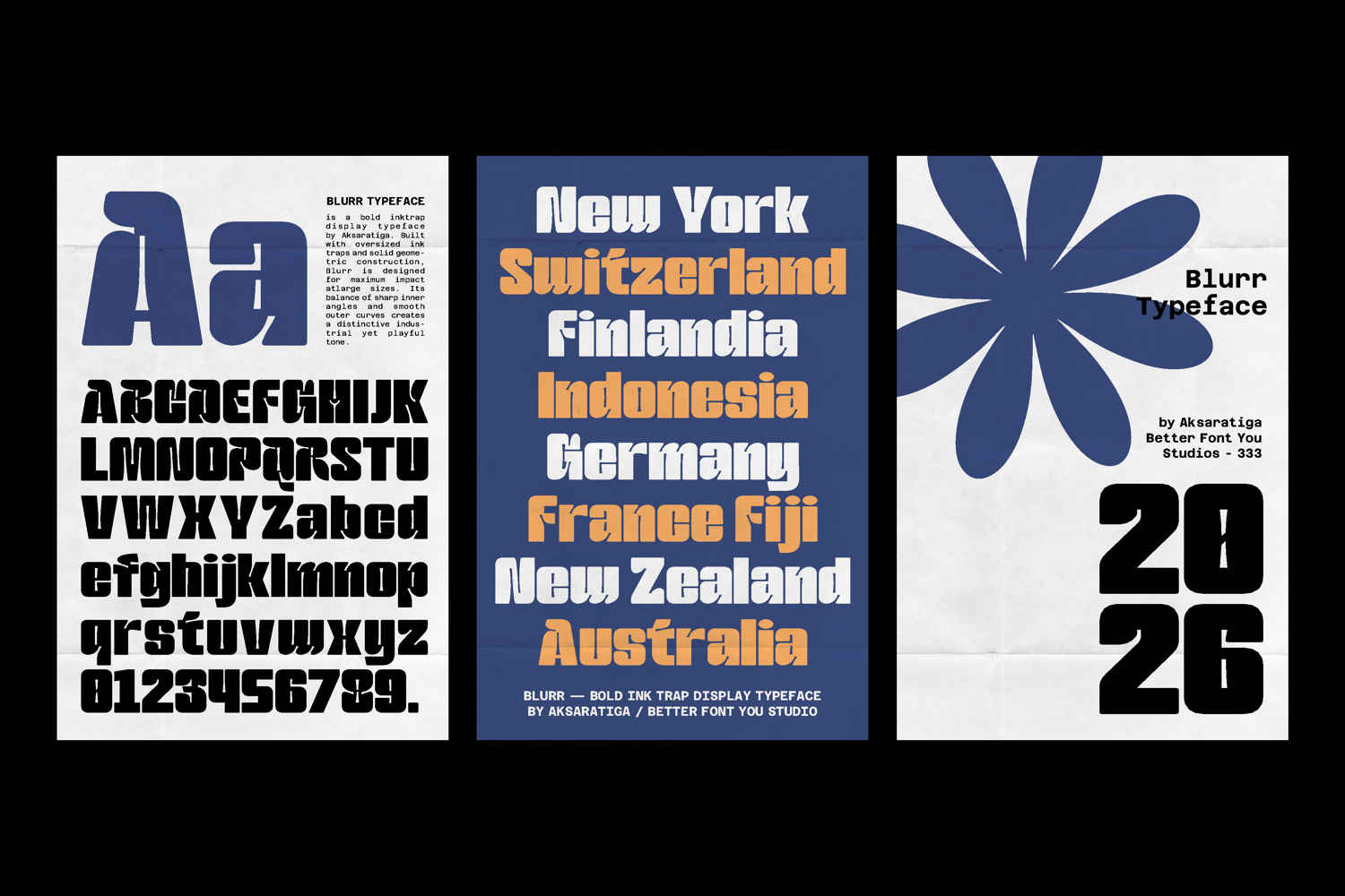 Blurr is a bold inktrap display typeface by Aksaratiga. Built with oversized ink traps and solid geometric construction, Blurr is designed for maximum impact at large sizes. Its balance of sharp inner angles and smooth outer curves creates a distinctive industrial yet playful tone.