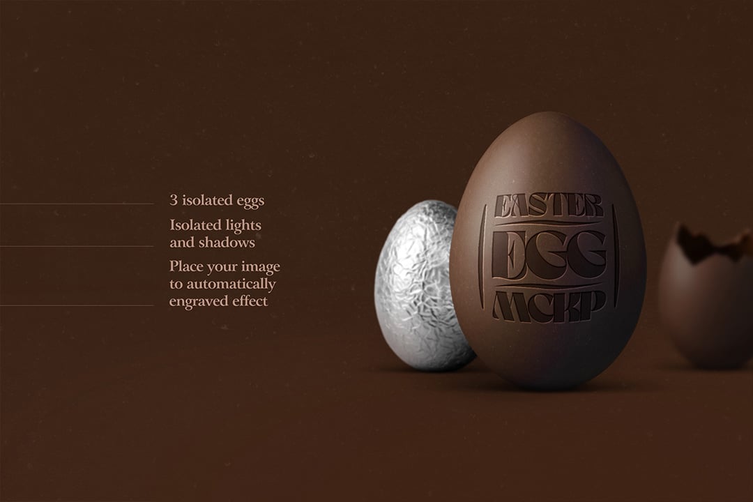 Photorealistic chocolate Easter egg PSD mockup with three isolated eggs and automatic engraved effect; fully editable Photoshop Smart Objects.