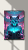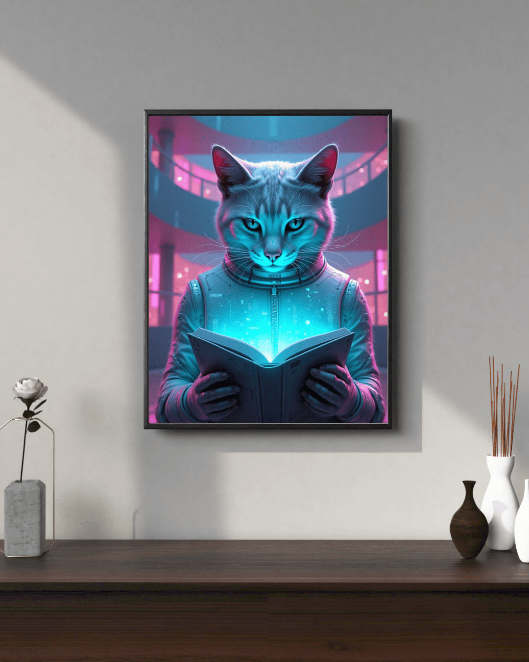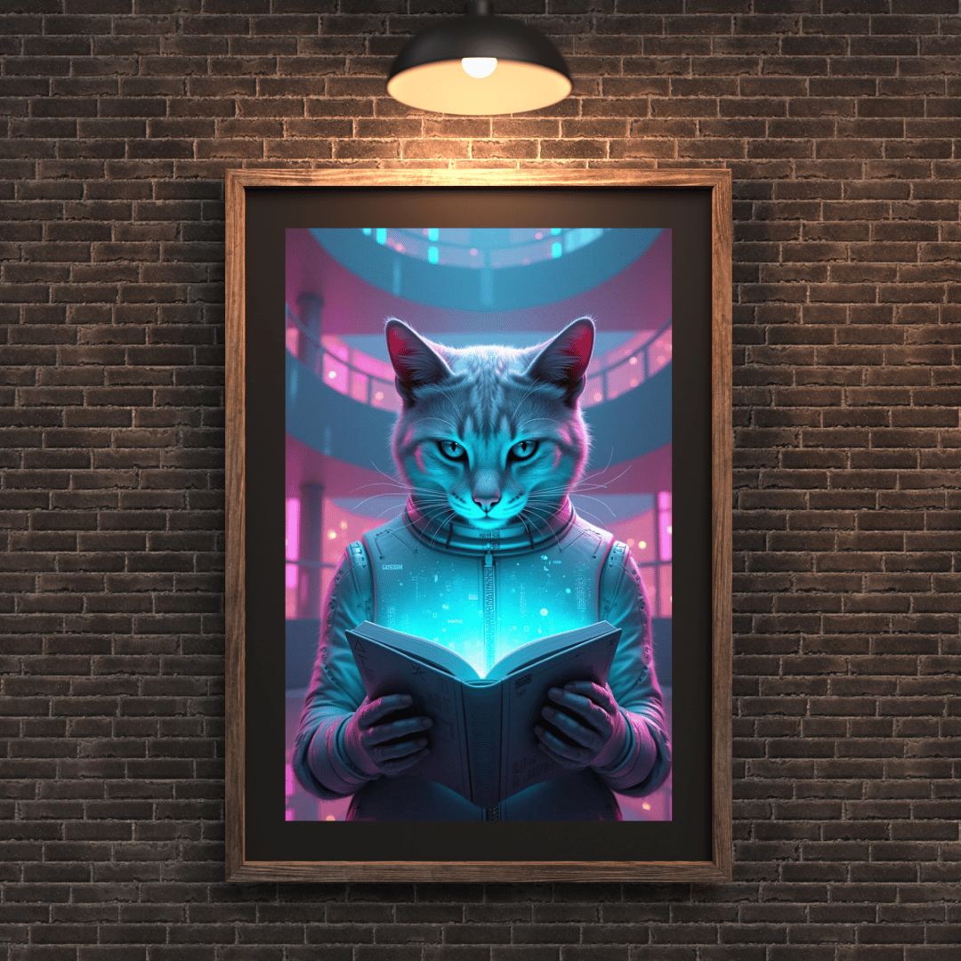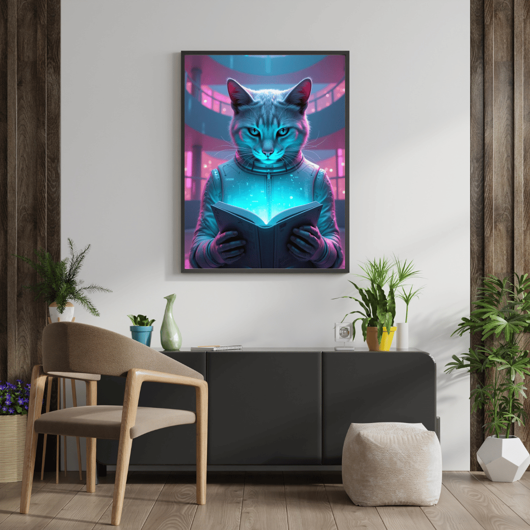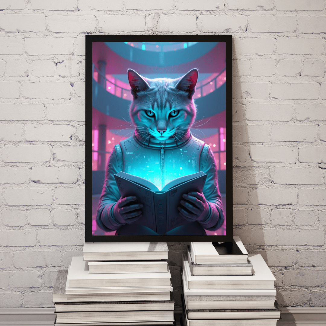 Add futuristic vibes to your space with this stunning cyberpunk cat wall art! Featuring a sleek AI-generated cat in a glowing space suit reading a holographic book, this sci-fi digital print is perfect for cat lovers, tech fans, and gamers. Ideal as home office decor or a unique gift idea, this instant download brings bold style and imagination to any wall.